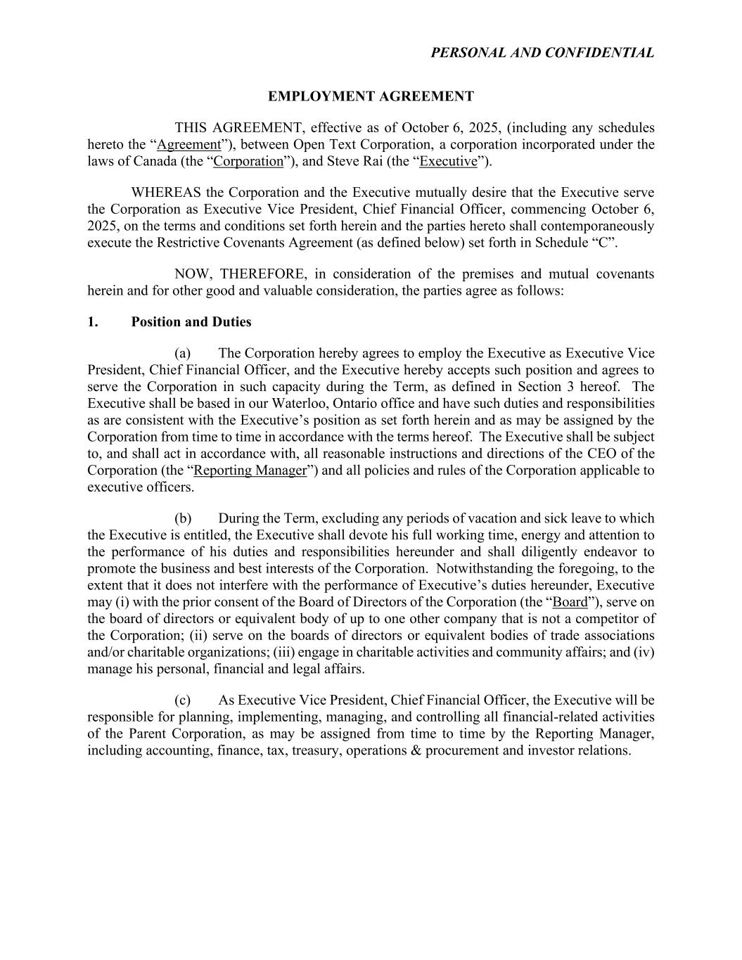 PERSONAL AND CONFIDENTIAL EMPLOYMENT AGREEMENT THIS AGREEMENT, effective as of October 6, 2025, (including any schedules hereto the “Agreement”), between Open Text Corporation, a corporation incorporated under the laws of Canada (the “Corporation”), and Steve Rai (the “Executive”). WHEREAS the Corporation and the Executive mutually desire that the Executive serve the Corporation as Executive Vice President, Chief Financial Officer, commencing October 6, 2025, on the terms and conditions set forth herein and the parties hereto shall contemporaneously execute the Restrictive Covenants Agreement (as defined below) set forth in Schedule “C”. NOW, THEREFORE, in consideration of the premises and mutual covenants herein and for other good and valuable consideration, the parties agree as follows: 1. Position and Duties (a) The Corporation hereby agrees to employ the Executive as Executive Vice President, Chief Financial Officer, and the Executive hereby accepts such position and agrees to serve the Corporation in such capacity during the Term, as defined in Section 3 hereof. The Executive shall be based in our Waterloo, Ontario office and have such duties and responsibilities as are consistent with the Executive’s position as set forth herein and as may be assigned by the Corporation from time to time in accordance with the terms hereof. The Executive shall be subject to, and shall act in accordance with, all reasonable instructions and directions of the CEO of the Corporation (the “Reporting Manager”) and all policies and rules of the Corporation applicable to executive officers. (b) During the Term, excluding any periods of vacation and sick leave to which the Executive is entitled, the Executive shall devote his full working time, energy and attention to the performance of his duties and responsibilities hereunder and shall diligently endeavor to promote the business and best interests of the Corporation. Notwithstanding the foregoing, to the extent that it does not interfere with the performance of Executive’s duties hereunder, Executive may (i) with the prior consent of the Board of Directors of the Corporation (the “Board”), serve on the board of directors or equivalent body of up to one other company that is not a competitor of the Corporation; (ii) serve on the boards of directors or equivalent bodies of trade associations and/or charitable organizations; (iii) engage in charitable activities and community affairs; and (iv) manage his personal, financial and legal affairs. (c) As Executive Vice President, Chief Financial Officer, the Executive will be responsible for planning, implementing, managing, and controlling all financial-related activities of the Parent Corporation, as may be assigned from time to time by the Reporting Manager, including accounting, finance, tax, treasury, operations & procurement and investor relations.