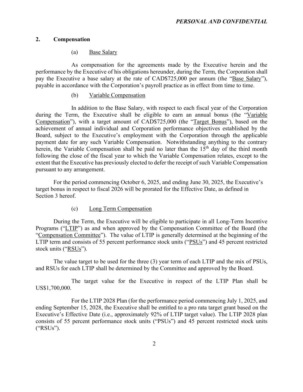PERSONAL AND CONFIDENTIAL 2 2. Compensation (a) Base Salary As compensation for the agreements made by the Executive herein and the performance by the Executive of his obligations hereunder, during the Term, the Corporation shall pay the Executive a base salary at the rate of CAD$725,000 per annum (the “Base Salary”), payable in accordance with the Corporation’s payroll practice as in effect from time to time. (b) Variable Compensation In addition to the Base Salary, with respect to each fiscal year of the Corporation during the Term, the Executive shall be eligible to earn an annual bonus (the “Variable Compensation”), with a target amount of CAD$725,000 (the “Target Bonus”), based on the achievement of annual individual and Corporation performance objectives established by the Board, subject to the Executive’s employment with the Corporation through the applicable payment date for any such Variable Compensation. Notwithstanding anything to the contrary herein, the Variable Compensation shall be paid no later than the 15th day of the third month following the close of the fiscal year to which the Variable Compensation relates, except to the extent that the Executive has previously elected to defer the receipt of such Variable Compensation pursuant to any arrangement. For the period commencing October 6, 2025, and ending June 30, 2025, the Executive’s target bonus in respect to fiscal 2026 will be prorated for the Effective Date, as defined in Section 3 hereof. (c) Long Term Compensation During the Term, the Executive will be eligible to participate in all Long-Term Incentive Programs (“LTIP”) as and when approved by the Compensation Committee of the Board (the “Compensation Committee”). The value of LTIP is generally determined at the beginning of the LTIP term and consists of 55 percent performance stock units (“PSUs”) and 45 percent restricted stock units (“RSUs”). The value target to be used for the three (3) year term of each LTIP and the mix of PSUs, and RSUs for each LTIP shall be determined by the Committee and approved by the Board. The target value for the Executive in respect of the LTIP Plan shall be US$1,700,000. For the LTIP 2028 Plan (for the performance period commencing July 1, 2025, and ending September 15, 2028, the Executive shall be entitled to a pro rata target grant based on the Executive’s Effective Date (i.e., approximately 92% of LTIP target value). The LTIP 2028 plan consists of 55 percent performance stock units (“PSUs”) and 45 percent restricted stock units (“RSUs”).