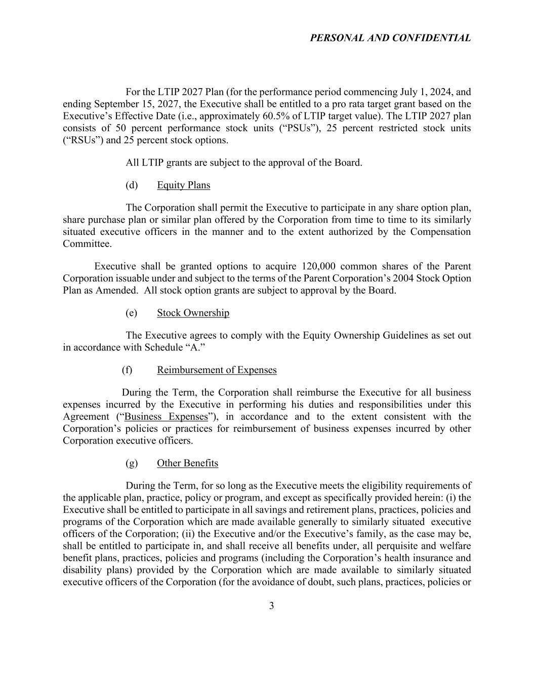 PERSONAL AND CONFIDENTIAL 3 For the LTIP 2027 Plan (for the performance period commencing July 1, 2024, and ending September 15, 2027, the Executive shall be entitled to a pro rata target grant based on the Executive’s Effective Date (i.e., approximately 60.5% of LTIP target value). The LTIP 2027 plan consists of 50 percent performance stock units (“PSUs”), 25 percent restricted stock units (“RSUs”) and 25 percent stock options. All LTIP grants are subject to the approval of the Board. (d) Equity Plans The Corporation shall permit the Executive to participate in any share option plan, share purchase plan or similar plan offered by the Corporation from time to time to its similarly situated executive officers in the manner and to the extent authorized by the Compensation Committee. Executive shall be granted options to acquire 120,000 common shares of the Parent Corporation issuable under and subject to the terms of the Parent Corporation’s 2004 Stock Option Plan as Amended. All stock option grants are subject to approval by the Board. (e) Stock Ownership The Executive agrees to comply with the Equity Ownership Guidelines as set out in accordance with Schedule “A.” (f) Reimbursement of Expenses During the Term, the Corporation shall reimburse the Executive for all business expenses incurred by the Executive in performing his duties and responsibilities under this Agreement (“Business Expenses”), in accordance and to the extent consistent with the Corporation’s policies or practices for reimbursement of business expenses incurred by other Corporation executive officers. (g) Other Benefits During the Term, for so long as the Executive meets the eligibility requirements of the applicable plan, practice, policy or program, and except as specifically provided herein: (i) the Executive shall be entitled to participate in all savings and retirement plans, practices, policies and programs of the Corporation which are made available generally to similarly situated executive officers of the Corporation; (ii) the Executive and/or the Executive’s family, as the case may be, shall be entitled to participate in, and shall receive all benefits under, all perquisite and welfare benefit plans, practices, policies and programs (including the Corporation’s health insurance and disability plans) provided by the Corporation which are made available to similarly situated executive officers of the Corporation (for the avoidance of doubt, such plans, practices, policies or