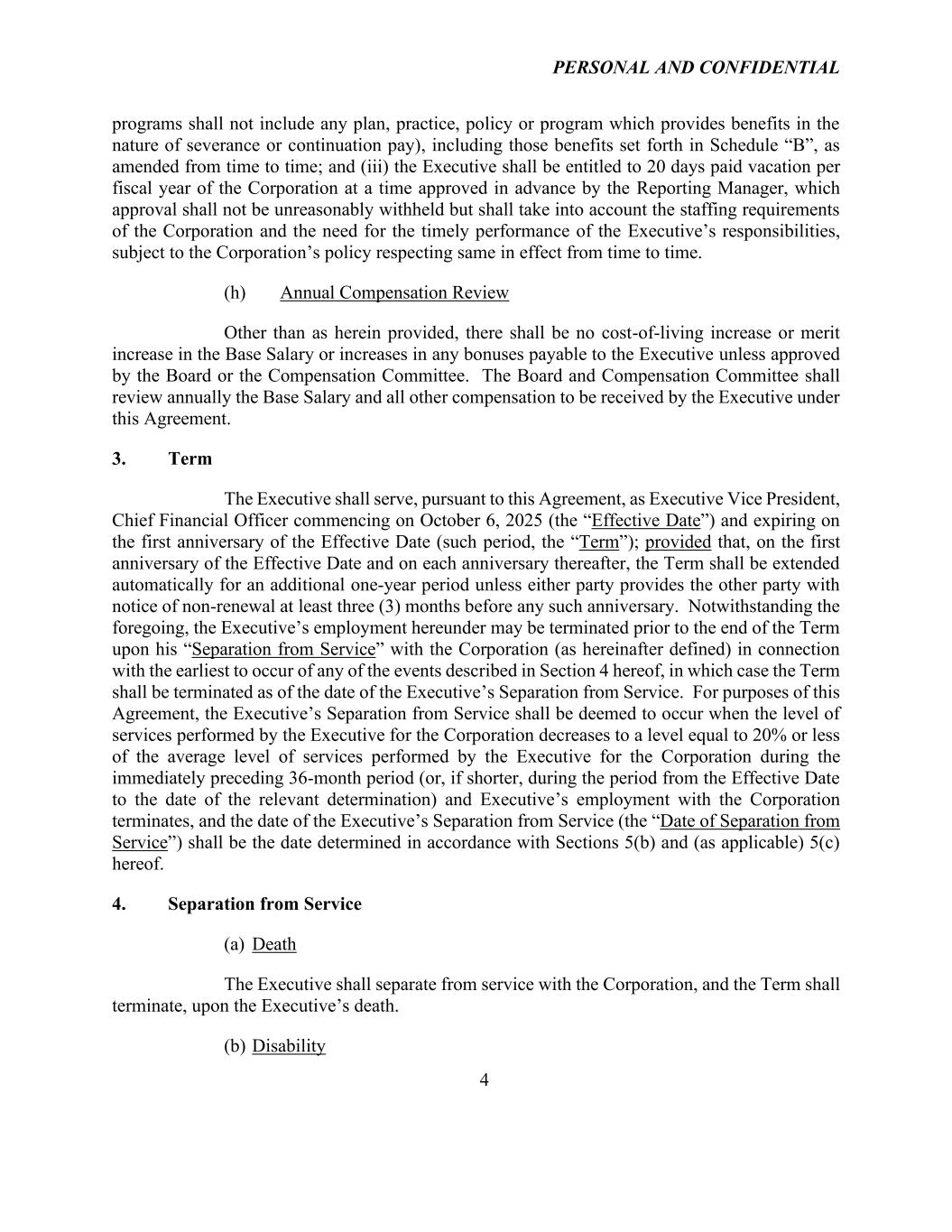 PERSONAL AND CONFIDENTIAL 4 programs shall not include any plan, practice, policy or program which provides benefits in the nature of severance or continuation pay), including those benefits set forth in Schedule “B”, as amended from time to time; and (iii) the Executive shall be entitled to 20 days paid vacation per fiscal year of the Corporation at a time approved in advance by the Reporting Manager, which approval shall not be unreasonably withheld but shall take into account the staffing requirements of the Corporation and the need for the timely performance of the Executive’s responsibilities, subject to the Corporation’s policy respecting same in effect from time to time. (h) Annual Compensation Review Other than as herein provided, there shall be no cost-of-living increase or merit increase in the Base Salary or increases in any bonuses payable to the Executive unless approved by the Board or the Compensation Committee. The Board and Compensation Committee shall review annually the Base Salary and all other compensation to be received by the Executive under this Agreement. 3. Term The Executive shall serve, pursuant to this Agreement, as Executive Vice President, Chief Financial Officer commencing on October 6, 2025 (the “Effective Date”) and expiring on the first anniversary of the Effective Date (such period, the “Term”); provided that, on the first anniversary of the Effective Date and on each anniversary thereafter, the Term shall be extended automatically for an additional one-year period unless either party provides the other party with notice of non-renewal at least three (3) months before any such anniversary. Notwithstanding the foregoing, the Executive’s employment hereunder may be terminated prior to the end of the Term upon his “Separation from Service” with the Corporation (as hereinafter defined) in connection with the earliest to occur of any of the events described in Section 4 hereof, in which case the Term shall be terminated as of the date of the Executive’s Separation from Service. For purposes of this Agreement, the Executive’s Separation from Service shall be deemed to occur when the level of services performed by the Executive for the Corporation decreases to a level equal to 20% or less of the average level of services performed by the Executive for the Corporation during the immediately preceding 36-month period (or, if shorter, during the period from the Effective Date to the date of the relevant determination) and Executive’s employment with the Corporation terminates, and the date of the Executive’s Separation from Service (the “Date of Separation from Service”) shall be the date determined in accordance with Sections 5(b) and (as applicable) 5(c) hereof. 4. Separation from Service (a) Death The Executive shall separate from service with the Corporation, and the Term shall terminate, upon the Executive’s death. (b) Disability