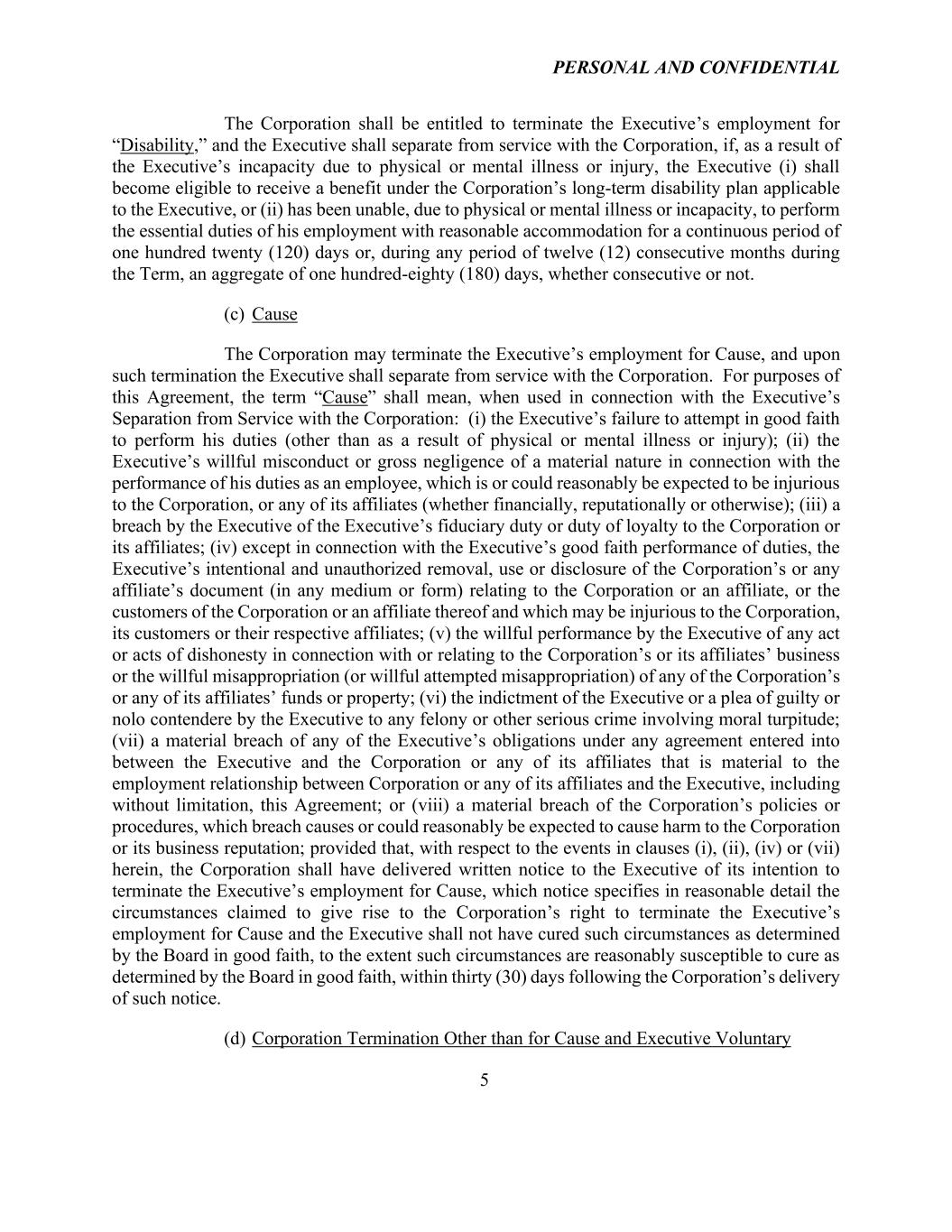 PERSONAL AND CONFIDENTIAL 5 The Corporation shall be entitled to terminate the Executive’s employment for “Disability,” and the Executive shall separate from service with the Corporation, if, as a result of the Executive’s incapacity due to physical or mental illness or injury, the Executive (i) shall become eligible to receive a benefit under the Corporation’s long-term disability plan applicable to the Executive, or (ii) has been unable, due to physical or mental illness or incapacity, to perform the essential duties of his employment with reasonable accommodation for a continuous period of one hundred twenty (120) days or, during any period of twelve (12) consecutive months during the Term, an aggregate of one hundred-eighty (180) days, whether consecutive or not. (c) Cause The Corporation may terminate the Executive’s employment for Cause, and upon such termination the Executive shall separate from service with the Corporation. For purposes of this Agreement, the term “Cause” shall mean, when used in connection with the Executive’s Separation from Service with the Corporation: (i) the Executive’s failure to attempt in good faith to perform his duties (other than as a result of physical or mental illness or injury); (ii) the Executive’s willful misconduct or gross negligence of a material nature in connection with the performance of his duties as an employee, which is or could reasonably be expected to be injurious to the Corporation, or any of its affiliates (whether financially, reputationally or otherwise); (iii) a breach by the Executive of the Executive’s fiduciary duty or duty of loyalty to the Corporation or its affiliates; (iv) except in connection with the Executive’s good faith performance of duties, the Executive’s intentional and unauthorized removal, use or disclosure of the Corporation’s or any affiliate’s document (in any medium or form) relating to the Corporation or an affiliate, or the customers of the Corporation or an affiliate thereof and which may be injurious to the Corporation, its customers or their respective affiliates; (v) the willful performance by the Executive of any act or acts of dishonesty in connection with or relating to the Corporation’s or its affiliates’ business or the willful misappropriation (or willful attempted misappropriation) of any of the Corporation’s or any of its affiliates’ funds or property; (vi) the indictment of the Executive or a plea of guilty or nolo contendere by the Executive to any felony or other serious crime involving moral turpitude; (vii) a material breach of any of the Executive’s obligations under any agreement entered into between the Executive and the Corporation or any of its affiliates that is material to the employment relationship between Corporation or any of its affiliates and the Executive, including without limitation, this Agreement; or (viii) a material breach of the Corporation’s policies or procedures, which breach causes or could reasonably be expected to cause harm to the Corporation or its business reputation; provided that, with respect to the events in clauses (i), (ii), (iv) or (vii) herein, the Corporation shall have delivered written notice to the Executive of its intention to terminate the Executive’s employment for Cause, which notice specifies in reasonable detail the circumstances claimed to give rise to the Corporation’s right to terminate the Executive’s employment for Cause and the Executive shall not have cured such circumstances as determined by the Board in good faith, to the extent such circumstances are reasonably susceptible to cure as determined by the Board in good faith, within thirty (30) days following the Corporation’s delivery of such notice. (d) Corporation Termination Other than for Cause and Executive Voluntary