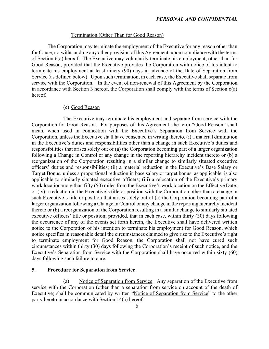 PERSONAL AND CONFIDENTIAL 6 Termination (Other Than for Good Reason) The Corporation may terminate the employment of the Executive for any reason other than for Cause, notwithstanding any other provision of this Agreement, upon compliance with the terms of Section 6(a) hereof. The Executive may voluntarily terminate his employment, other than for Good Reason, provided that the Executive provides the Corporation with notice of his intent to terminate his employment at least ninety (90) days in advance of the Date of Separation from Service (as defined below). Upon such termination, in each case, the Executive shall separate from service with the Corporation. In the event of non-renewal of this Agreement by the Corporation in accordance with Section 3 hereof, the Corporation shall comply with the terms of Section 6(a) hereof. (e) Good Reason The Executive may terminate his employment and separate from service with the Corporation for Good Reason. For purposes of this Agreement, the term “Good Reason” shall mean, when used in connection with the Executive’s Separation from Service with the Corporation, unless the Executive shall have consented in writing thereto, (i) a material diminution in the Executive’s duties and responsibilities other than a change in such Executive’s duties and responsibilities that arises solely out of (a) the Corporation becoming part of a larger organization following a Change in Control or any change in the reporting hierarchy incident thereto or (b) a reorganization of the Corporation resulting in a similar change to similarly situated executive officers’ duties and responsibilities; (ii) a material reduction in the Executive’s Base Salary or Target Bonus, unless a proportional reduction in base salary or target bonus, as applicable, is also applicable to similarly situated executive officers; (iii) a relocation of the Executive’s primary work location more than fifty (50) miles from the Executive’s work location on the Effective Date; or (iv) a reduction in the Executive’s title or position with the Corporation other than a change in such Executive’s title or position that arises solely out of (a) the Corporation becoming part of a larger organization following a Change in Control or any change in the reporting hierarchy incident thereto or (b) a reorganization of the Corporation resulting in a similar change to similarly situated executive officers’ title or position; provided, that in each case, within thirty (30) days following the occurrence of any of the events set forth herein, the Executive shall have delivered written notice to the Corporation of his intention to terminate his employment for Good Reason, which notice specifies in reasonable detail the circumstances claimed to give rise to the Executive’s right to terminate employment for Good Reason, the Corporation shall not have cured such circumstances within thirty (30) days following the Corporation’s receipt of such notice, and the Executive’s Separation from Service with the Corporation shall have occurred within sixty (60) days following such failure to cure. 5. Procedure for Separation from Service (a) Notice of Separation from Service. Any separation of the Executive from service with the Corporation (other than a separation from service on account of the death of Executive) shall be communicated by written “Notice of Separation from Service” to the other party hereto in accordance with Section 14(a) hereof.