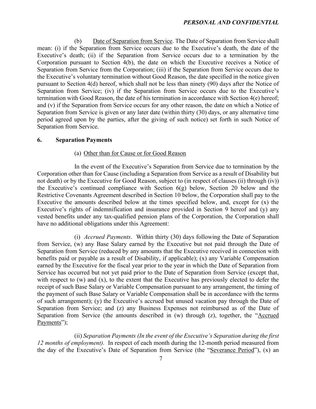 PERSONAL AND CONFIDENTIAL 7 (b) Date of Separation from Service. The Date of Separation from Service shall mean: (i) if the Separation from Service occurs due to the Executive’s death, the date of the Executive’s death; (ii) if the Separation from Service occurs due to a termination by the Corporation pursuant to Section 4(b), the date on which the Executive receives a Notice of Separation from Service from the Corporation; (iii) if the Separation from Service occurs due to the Executive’s voluntary termination without Good Reason, the date specified in the notice given pursuant to Section 4(d) hereof, which shall not be less than ninety (90) days after the Notice of Separation from Service; (iv) if the Separation from Service occurs due to the Executive’s termination with Good Reason, the date of his termination in accordance with Section 4(e) hereof; and (v) if the Separation from Service occurs for any other reason, the date on which a Notice of Separation from Service is given or any later date (within thirty (30) days, or any alternative time period agreed upon by the parties, after the giving of such notice) set forth in such Notice of Separation from Service. 6. Separation Payments (a) Other than for Cause or for Good Reason In the event of the Executive’s Separation from Service due to termination by the Corporation other than for Cause (including a Separation from Service as a result of Disability but not death) or by the Executive for Good Reason, subject to (in respect of clauses (ii) through (iv)) the Executive’s continued compliance with Section 6(g) below, Section 20 below and the Restrictive Covenants Agreement described in Section 10 below, the Corporation shall pay to the Executive the amounts described below at the times specified below, and, except for (x) the Executive’s rights of indemnification and insurance provided in Section 9 hereof and (y) any vested benefits under any tax-qualified pension plans of the Corporation, the Corporation shall have no additional obligations under this Agreement: (i) Accrued Payments. Within thirty (30) days following the Date of Separation from Service, (w) any Base Salary earned by the Executive but not paid through the Date of Separation from Service (reduced by any amounts that the Executive received in connection with benefits paid or payable as a result of Disability, if applicable); (x) any Variable Compensation earned by the Executive for the fiscal year prior to the year in which the Date of Separation from Service has occurred but not yet paid prior to the Date of Separation from Service (except that, with respect to (w) and (x), to the extent that the Executive has previously elected to defer the receipt of such Base Salary or Variable Compensation pursuant to any arrangement, the timing of the payment of such Base Salary or Variable Compensation shall be in accordance with the terms of such arrangement); (y) the Executive’s accrued but unused vacation pay through the Date of Separation from Service; and (z) any Business Expenses not reimbursed as of the Date of Separation from Service (the amounts described in (w) through (z), together, the “Accrued Payments”); (ii) Separation Payments (In the event of the Executive’s Separation during the first 12 months of employment). In respect of each month during the 12-month period measured from the day of the Executive’s Date of Separation from Service (the “Severance Period”), (x) an