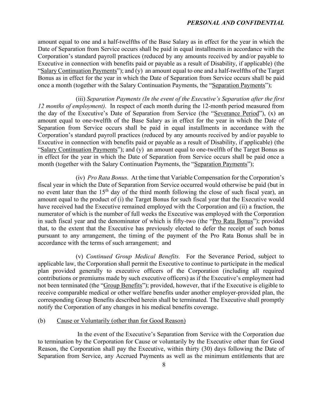 PERSONAL AND CONFIDENTIAL 8 amount equal to one and a half-twelfths of the Base Salary as in effect for the year in which the Date of Separation from Service occurs shall be paid in equal installments in accordance with the Corporation’s standard payroll practices (reduced by any amounts received by and/or payable to Executive in connection with benefits paid or payable as a result of Disability, if applicable) (the “Salary Continuation Payments”); and (y) an amount equal to one and a half-twelfths of the Target Bonus as in effect for the year in which the Date of Separation from Service occurs shall be paid once a month (together with the Salary Continuation Payments, the “Separation Payments”); (iii) Separation Payments (In the event of the Executive’s Separation after the first 12 months of employment). In respect of each month during the 12-month period measured from the day of the Executive’s Date of Separation from Service (the “Severance Period”), (x) an amount equal to one-twelfth of the Base Salary as in effect for the year in which the Date of Separation from Service occurs shall be paid in equal installments in accordance with the Corporation’s standard payroll practices (reduced by any amounts received by and/or payable to Executive in connection with benefits paid or payable as a result of Disability, if applicable) (the “Salary Continuation Payments”); and (y) an amount equal to one-twelfth of the Target Bonus as in effect for the year in which the Date of Separation from Service occurs shall be paid once a month (together with the Salary Continuation Payments, the “Separation Payments”); (iv) Pro Rata Bonus. At the time that Variable Compensation for the Corporation’s fiscal year in which the Date of Separation from Service occurred would otherwise be paid (but in no event later than the 15th day of the third month following the close of such fiscal year), an amount equal to the product of (i) the Target Bonus for such fiscal year that the Executive would have received had the Executive remained employed with the Corporation and (ii) a fraction, the numerator of which is the number of full weeks the Executive was employed with the Corporation in such fiscal year and the denominator of which is fifty-two (the “Pro Rata Bonus”); provided that, to the extent that the Executive has previously elected to defer the receipt of such bonus pursuant to any arrangement, the timing of the payment of the Pro Rata Bonus shall be in accordance with the terms of such arrangement; and (v) Continued Group Medical Benefits. For the Severance Period, subject to applicable law, the Corporation shall permit the Executive to continue to participate in the medical plan provided generally to executive officers of the Corporation (including all required contributions or premiums made by such executive officers) as if the Executive’s employment had not been terminated (the “Group Benefits”); provided, however, that if the Executive is eligible to receive comparable medical or other welfare benefits under another employer-provided plan, the corresponding Group Benefits described herein shall be terminated. The Executive shall promptly notify the Corporation of any changes in his medical benefits coverage. (b) Cause or Voluntarily (other than for Good Reason) In the event of the Executive’s Separation from Service with the Corporation due to termination by the Corporation for Cause or voluntarily by the Executive other than for Good Reason, the Corporation shall pay the Executive, within thirty (30) days following the Date of Separation from Service, any Accrued Payments as well as the minimum entitlements that are