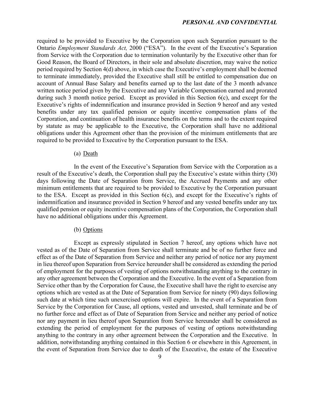 PERSONAL AND CONFIDENTIAL 9 required to be provided to Executive by the Corporation upon such Separation pursuant to the Ontario Employment Standards Act, 2000 (“ESA”). In the event of the Executive’s Separation from Service with the Corporation due to termination voluntarily by the Executive other than for Good Reason, the Board of Directors, in their sole and absolute discretion, may waive the notice period required by Section 4(d) above, in which case the Executive’s employment shall be deemed to terminate immediately, provided the Executive shall still be entitled to compensation due on account of Annual Base Salary and benefits earned up to the last date of the 3 month advance written notice period given by the Executive and any Variable Compensation earned and prorated during such 3 month notice period. Except as provided in this Section 6(c), and except for the Executive’s rights of indemnification and insurance provided in Section 9 hereof and any vested benefits under any tax qualified pension or equity incentive compensation plans of the Corporation, and continuation of health insurance benefits on the terms and to the extent required by statute as may be applicable to the Executive, the Corporation shall have no additional obligations under this Agreement other than the provision of the minimum entitlements that are required to be provided to Executive by the Corporation pursuant to the ESA. (a) Death In the event of the Executive’s Separation from Service with the Corporation as a result of the Executive’s death, the Corporation shall pay the Executive’s estate within thirty (30) days following the Date of Separation from Service, the Accrued Payments and any other minimum entitlements that are required to be provided to Executive by the Corporation pursuant to the ESA. Except as provided in this Section 6(c), and except for the Executive’s rights of indemnification and insurance provided in Section 9 hereof and any vested benefits under any tax qualified pension or equity incentive compensation plans of the Corporation, the Corporation shall have no additional obligations under this Agreement. (b) Options Except as expressly stipulated in Section 7 hereof, any options which have not vested as of the Date of Separation from Service shall terminate and be of no further force and effect as of the Date of Separation from Service and neither any period of notice nor any payment in lieu thereof upon Separation from Service hereunder shall be considered as extending the period of employment for the purposes of vesting of options notwithstanding anything to the contrary in any other agreement between the Corporation and the Executive. In the event of a Separation from Service other than by the Corporation for Cause, the Executive shall have the right to exercise any options which are vested as at the Date of Separation from Service for ninety (90) days following such date at which time such unexercised options will expire. In the event of a Separation from Service by the Corporation for Cause, all options, vested and unvested, shall terminate and be of no further force and effect as of Date of Separation from Service and neither any period of notice nor any payment in lieu thereof upon Separation from Service hereunder shall be considered as extending the period of employment for the purposes of vesting of options notwithstanding anything to the contrary in any other agreement between the Corporation and the Executive. In addition, notwithstanding anything contained in this Section 6 or elsewhere in this Agreement, in the event of Separation from Service due to death of the Executive, the estate of the Executive
