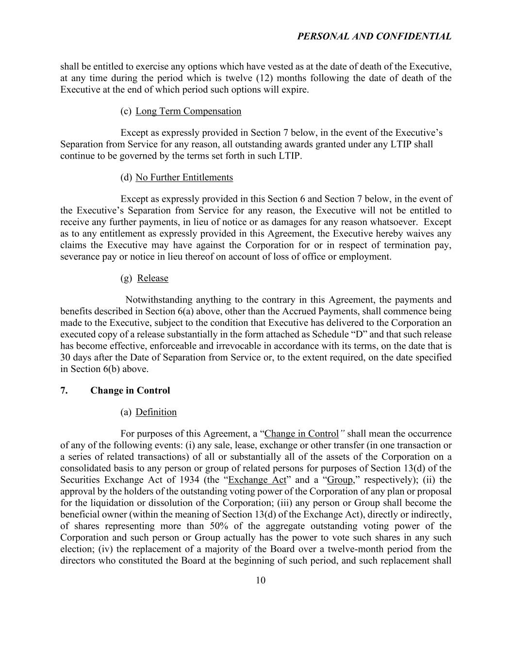 PERSONAL AND CONFIDENTIAL 10 shall be entitled to exercise any options which have vested as at the date of death of the Executive, at any time during the period which is twelve (12) months following the date of death of the Executive at the end of which period such options will expire. (c) Long Term Compensation Except as expressly provided in Section 7 below, in the event of the Executive’s Separation from Service for any reason, all outstanding awards granted under any LTIP shall continue to be governed by the terms set forth in such LTIP. (d) No Further Entitlements Except as expressly provided in this Section 6 and Section 7 below, in the event of the Executive’s Separation from Service for any reason, the Executive will not be entitled to receive any further payments, in lieu of notice or as damages for any reason whatsoever. Except as to any entitlement as expressly provided in this Agreement, the Executive hereby waives any claims the Executive may have against the Corporation for or in respect of termination pay, severance pay or notice in lieu thereof on account of loss of office or employment. (g) Release Notwithstanding anything to the contrary in this Agreement, the payments and benefits described in Section 6(a) above, other than the Accrued Payments, shall commence being made to the Executive, subject to the condition that Executive has delivered to the Corporation an executed copy of a release substantially in the form attached as Schedule “D” and that such release has become effective, enforceable and irrevocable in accordance with its terms, on the date that is 30 days after the Date of Separation from Service or, to the extent required, on the date specified in Section 6(b) above. 7. Change in Control (a) Definition For purposes of this Agreement, a “Change in Control” shall mean the occurrence of any of the following events: (i) any sale, lease, exchange or other transfer (in one transaction or a series of related transactions) of all or substantially all of the assets of the Corporation on a consolidated basis to any person or group of related persons for purposes of Section 13(d) of the Securities Exchange Act of 1934 (the “Exchange Act” and a “Group,” respectively); (ii) the approval by the holders of the outstanding voting power of the Corporation of any plan or proposal for the liquidation or dissolution of the Corporation; (iii) any person or Group shall become the beneficial owner (within the meaning of Section 13(d) of the Exchange Act), directly or indirectly, of shares representing more than 50% of the aggregate outstanding voting power of the Corporation and such person or Group actually has the power to vote such shares in any such election; (iv) the replacement of a majority of the Board over a twelve-month period from the directors who constituted the Board at the beginning of such period, and such replacement shall