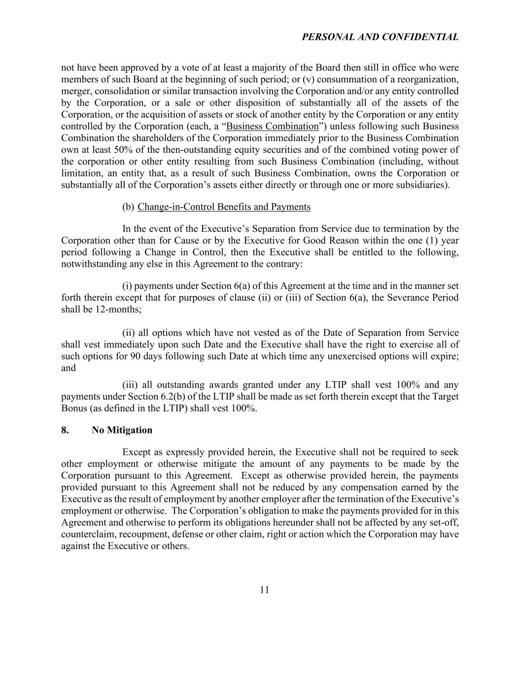 PERSONAL AND CONFIDENTIAL 11 not have been approved by a vote of at least a majority of the Board then still in office who were members of such Board at the beginning of such period; or (v) consummation of a reorganization, merger, consolidation or similar transaction involving the Corporation and/or any entity controlled by the Corporation, or a sale or other disposition of substantially all of the assets of the Corporation, or the acquisition of assets or stock of another entity by the Corporation or any entity controlled by the Corporation (each, a “Business Combination”) unless following such Business Combination the shareholders of the Corporation immediately prior to the Business Combination own at least 50% of the then-outstanding equity securities and of the combined voting power of the corporation or other entity resulting from such Business Combination (including, without limitation, an entity that, as a result of such Business Combination, owns the Corporation or substantially all of the Corporation’s assets either directly or through one or more subsidiaries). (b) Change-in-Control Benefits and Payments In the event of the Executive’s Separation from Service due to termination by the Corporation other than for Cause or by the Executive for Good Reason within the one (1) year period following a Change in Control, then the Executive shall be entitled to the following, notwithstanding any else in this Agreement to the contrary: (i) payments under Section 6(a) of this Agreement at the time and in the manner set forth therein except that for purposes of clause (ii) or (iii) of Section 6(a), the Severance Period shall be 12-months; (ii) all options which have not vested as of the Date of Separation from Service shall vest immediately upon such Date and the Executive shall have the right to exercise all of such options for 90 days following such Date at which time any unexercised options will expire; and (iii) all outstanding awards granted under any LTIP shall vest 100% and any payments under Section 6.2(b) of the LTIP shall be made as set forth therein except that the Target Bonus (as defined in the LTIP) shall vest 100%. 8. No Mitigation Except as expressly provided herein, the Executive shall not be required to seek other employment or otherwise mitigate the amount of any payments to be made by the Corporation pursuant to this Agreement. Except as otherwise provided herein, the payments provided pursuant to this Agreement shall not be reduced by any compensation earned by the Executive as the result of employment by another employer after the termination of the Executive’s employment or otherwise. The Corporation’s obligation to make the payments provided for in this Agreement and otherwise to perform its obligations hereunder shall not be affected by any set-off, counterclaim, recoupment, defense or other claim, right or action which the Corporation may have against the Executive or others.