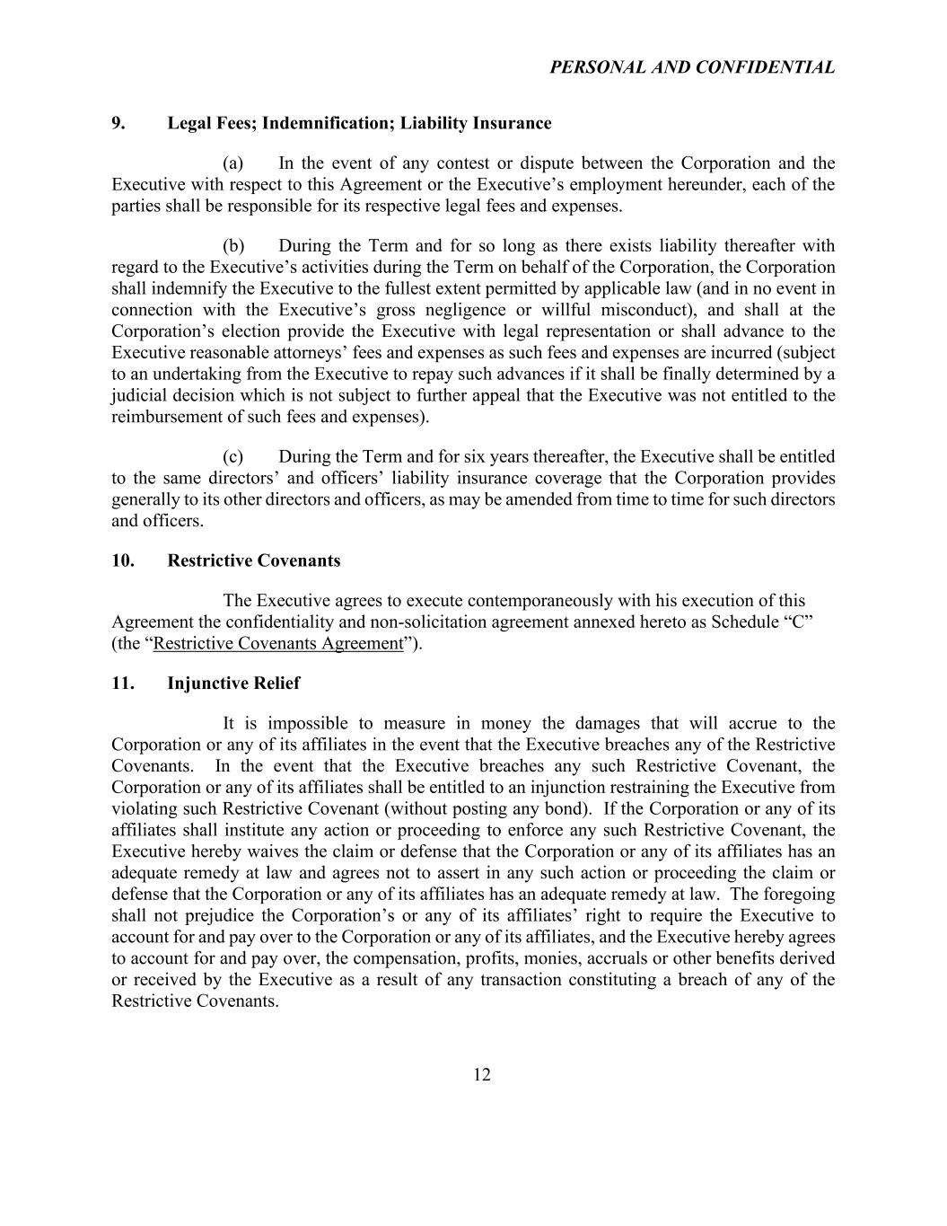 PERSONAL AND CONFIDENTIAL 12 9. Legal Fees; Indemnification; Liability Insurance (a) In the event of any contest or dispute between the Corporation and the Executive with respect to this Agreement or the Executive’s employment hereunder, each of the parties shall be responsible for its respective legal fees and expenses. (b) During the Term and for so long as there exists liability thereafter with regard to the Executive’s activities during the Term on behalf of the Corporation, the Corporation shall indemnify the Executive to the fullest extent permitted by applicable law (and in no event in connection with the Executive’s gross negligence or willful misconduct), and shall at the Corporation’s election provide the Executive with legal representation or shall advance to the Executive reasonable attorneys’ fees and expenses as such fees and expenses are incurred (subject to an undertaking from the Executive to repay such advances if it shall be finally determined by a judicial decision which is not subject to further appeal that the Executive was not entitled to the reimbursement of such fees and expenses). (c) During the Term and for six years thereafter, the Executive shall be entitled to the same directors’ and officers’ liability insurance coverage that the Corporation provides generally to its other directors and officers, as may be amended from time to time for such directors and officers. 10. Restrictive Covenants The Executive agrees to execute contemporaneously with his execution of this Agreement the confidentiality and non-solicitation agreement annexed hereto as Schedule “C” (the “Restrictive Covenants Agreement”). 11. Injunctive Relief It is impossible to measure in money the damages that will accrue to the Corporation or any of its affiliates in the event that the Executive breaches any of the Restrictive Covenants. In the event that the Executive breaches any such Restrictive Covenant, the Corporation or any of its affiliates shall be entitled to an injunction restraining the Executive from violating such Restrictive Covenant (without posting any bond). If the Corporation or any of its affiliates shall institute any action or proceeding to enforce any such Restrictive Covenant, the Executive hereby waives the claim or defense that the Corporation or any of its affiliates has an adequate remedy at law and agrees not to assert in any such action or proceeding the claim or defense that the Corporation or any of its affiliates has an adequate remedy at law. The foregoing shall not prejudice the Corporation’s or any of its affiliates’ right to require the Executive to account for and pay over to the Corporation or any of its affiliates, and the Executive hereby agrees to account for and pay over, the compensation, profits, monies, accruals or other benefits derived or received by the Executive as a result of any transaction constituting a breach of any of the Restrictive Covenants.