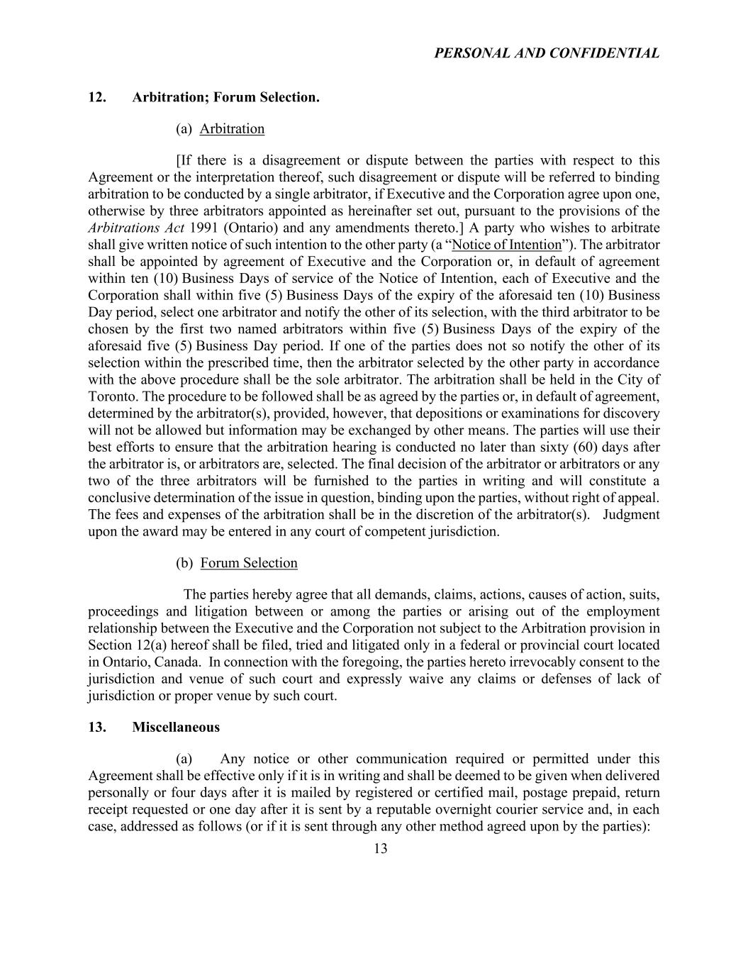 PERSONAL AND CONFIDENTIAL 13 12. Arbitration; Forum Selection. (a) Arbitration [If there is a disagreement or dispute between the parties with respect to this Agreement or the interpretation thereof, such disagreement or dispute will be referred to binding arbitration to be conducted by a single arbitrator, if Executive and the Corporation agree upon one, otherwise by three arbitrators appointed as hereinafter set out, pursuant to the provisions of the Arbitrations Act 1991 (Ontario) and any amendments thereto.] A party who wishes to arbitrate shall give written notice of such intention to the other party (a “Notice of Intention”). The arbitrator shall be appointed by agreement of Executive and the Corporation or, in default of agreement within ten (10) Business Days of service of the Notice of Intention, each of Executive and the Corporation shall within five (5) Business Days of the expiry of the aforesaid ten (10) Business Day period, select one arbitrator and notify the other of its selection, with the third arbitrator to be chosen by the first two named arbitrators within five (5) Business Days of the expiry of the aforesaid five (5) Business Day period. If one of the parties does not so notify the other of its selection within the prescribed time, then the arbitrator selected by the other party in accordance with the above procedure shall be the sole arbitrator. The arbitration shall be held in the City of Toronto. The procedure to be followed shall be as agreed by the parties or, in default of agreement, determined by the arbitrator(s), provided, however, that depositions or examinations for discovery will not be allowed but information may be exchanged by other means. The parties will use their best efforts to ensure that the arbitration hearing is conducted no later than sixty (60) days after the arbitrator is, or arbitrators are, selected. The final decision of the arbitrator or arbitrators or any two of the three arbitrators will be furnished to the parties in writing and will constitute a conclusive determination of the issue in question, binding upon the parties, without right of appeal. The fees and expenses of the arbitration shall be in the discretion of the arbitrator(s). Judgment upon the award may be entered in any court of competent jurisdiction. (b) Forum Selection The parties hereby agree that all demands, claims, actions, causes of action, suits, proceedings and litigation between or among the parties or arising out of the employment relationship between the Executive and the Corporation not subject to the Arbitration provision in Section 12(a) hereof shall be filed, tried and litigated only in a federal or provincial court located in Ontario, Canada. In connection with the foregoing, the parties hereto irrevocably consent to the jurisdiction and venue of such court and expressly waive any claims or defenses of lack of jurisdiction or proper venue by such court. 13. Miscellaneous (a) Any notice or other communication required or permitted under this Agreement shall be effective only if it is in writing and shall be deemed to be given when delivered personally or four days after it is mailed by registered or certified mail, postage prepaid, return receipt requested or one day after it is sent by a reputable overnight courier service and, in each case, addressed as follows (or if it is sent through any other method agreed upon by the parties):