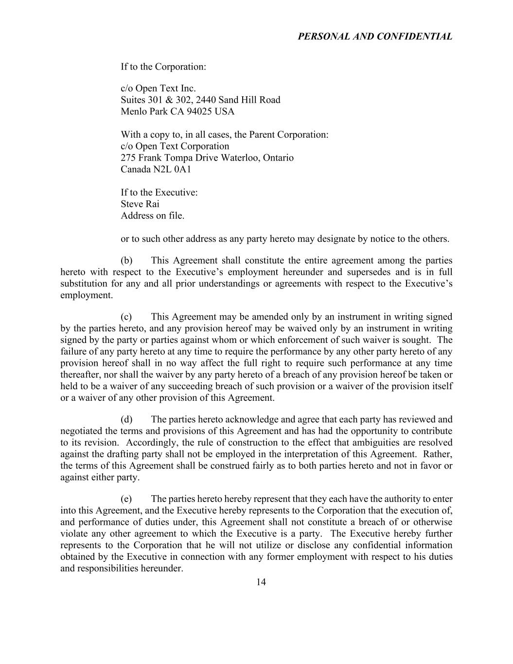 PERSONAL AND CONFIDENTIAL 14 If to the Corporation: c/o Open Text Inc. Suites 301 & 302, 2440 Sand Hill Road Menlo Park CA 94025 USA With a copy to, in all cases, the Parent Corporation: c/o Open Text Corporation 275 Frank Tompa Drive Waterloo, Ontario Canada N2L 0A1 If to the Executive: Steve Rai Address on file. or to such other address as any party hereto may designate by notice to the others. (b) This Agreement shall constitute the entire agreement among the parties hereto with respect to the Executive’s employment hereunder and supersedes and is in full substitution for any and all prior understandings or agreements with respect to the Executive’s employment. (c) This Agreement may be amended only by an instrument in writing signed by the parties hereto, and any provision hereof may be waived only by an instrument in writing signed by the party or parties against whom or which enforcement of such waiver is sought. The failure of any party hereto at any time to require the performance by any other party hereto of any provision hereof shall in no way affect the full right to require such performance at any time thereafter, nor shall the waiver by any party hereto of a breach of any provision hereof be taken or held to be a waiver of any succeeding breach of such provision or a waiver of the provision itself or a waiver of any other provision of this Agreement. (d) The parties hereto acknowledge and agree that each party has reviewed and negotiated the terms and provisions of this Agreement and has had the opportunity to contribute to its revision. Accordingly, the rule of construction to the effect that ambiguities are resolved against the drafting party shall not be employed in the interpretation of this Agreement. Rather, the terms of this Agreement shall be construed fairly as to both parties hereto and not in favor or against either party. (e) The parties hereto hereby represent that they each have the authority to enter into this Agreement, and the Executive hereby represents to the Corporation that the execution of, and performance of duties under, this Agreement shall not constitute a breach of or otherwise violate any other agreement to which the Executive is a party. The Executive hereby further represents to the Corporation that he will not utilize or disclose any confidential information obtained by the Executive in connection with any former employment with respect to his duties and responsibilities hereunder.