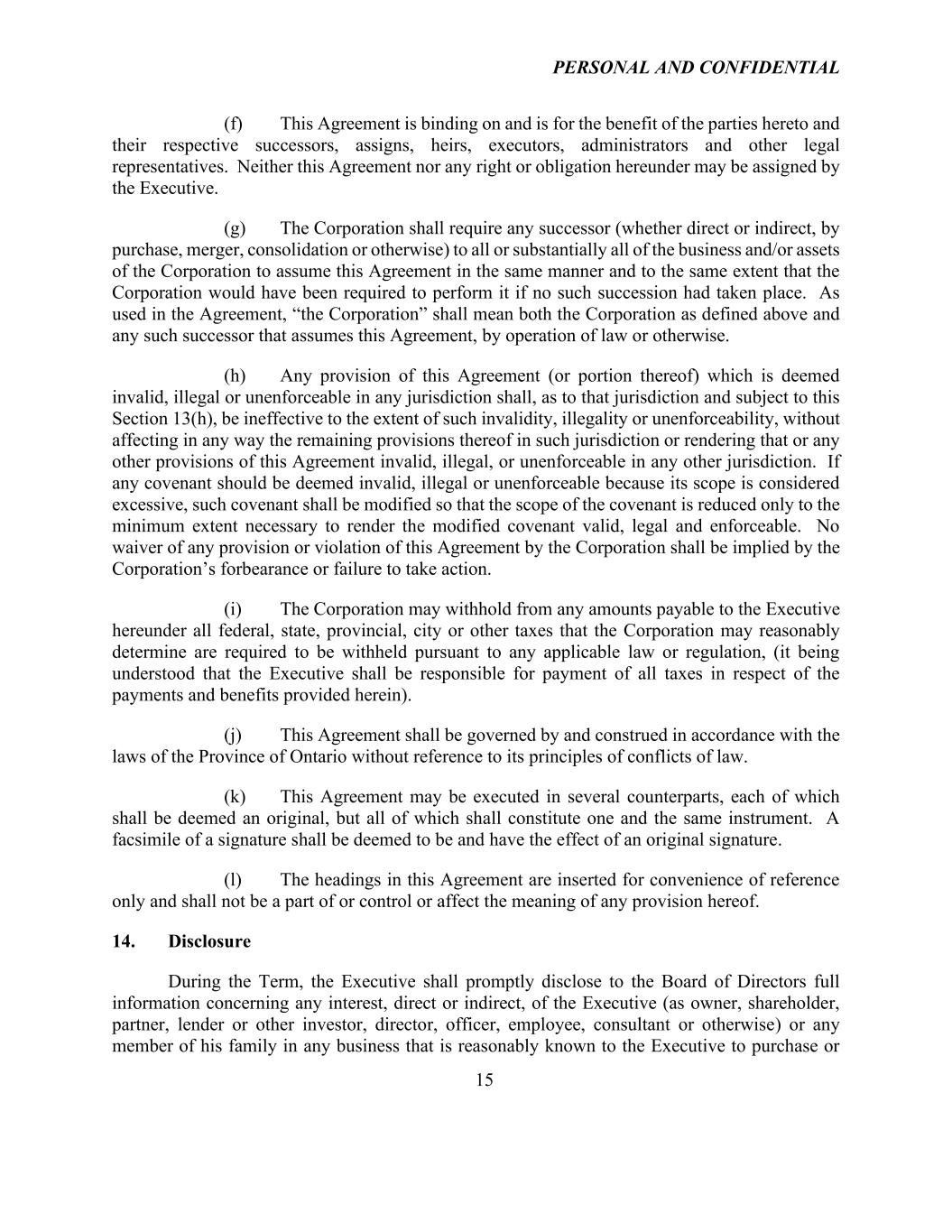 PERSONAL AND CONFIDENTIAL 15 (f) This Agreement is binding on and is for the benefit of the parties hereto and their respective successors, assigns, heirs, executors, administrators and other legal representatives. Neither this Agreement nor any right or obligation hereunder may be assigned by the Executive. (g) The Corporation shall require any successor (whether direct or indirect, by purchase, merger, consolidation or otherwise) to all or substantially all of the business and/or assets of the Corporation to assume this Agreement in the same manner and to the same extent that the Corporation would have been required to perform it if no such succession had taken place. As used in the Agreement, “the Corporation” shall mean both the Corporation as defined above and any such successor that assumes this Agreement, by operation of law or otherwise. (h) Any provision of this Agreement (or portion thereof) which is deemed invalid, illegal or unenforceable in any jurisdiction shall, as to that jurisdiction and subject to this Section 13(h), be ineffective to the extent of such invalidity, illegality or unenforceability, without affecting in any way the remaining provisions thereof in such jurisdiction or rendering that or any other provisions of this Agreement invalid, illegal, or unenforceable in any other jurisdiction. If any covenant should be deemed invalid, illegal or unenforceable because its scope is considered excessive, such covenant shall be modified so that the scope of the covenant is reduced only to the minimum extent necessary to render the modified covenant valid, legal and enforceable. No waiver of any provision or violation of this Agreement by the Corporation shall be implied by the Corporation’s forbearance or failure to take action. (i) The Corporation may withhold from any amounts payable to the Executive hereunder all federal, state, provincial, city or other taxes that the Corporation may reasonably determine are required to be withheld pursuant to any applicable law or regulation, (it being understood that the Executive shall be responsible for payment of all taxes in respect of the payments and benefits provided herein). (j) This Agreement shall be governed by and construed in accordance with the laws of the Province of Ontario without reference to its principles of conflicts of law. (k) This Agreement may be executed in several counterparts, each of which shall be deemed an original, but all of which shall constitute one and the same instrument. A facsimile of a signature shall be deemed to be and have the effect of an original signature. (l) The headings in this Agreement are inserted for convenience of reference only and shall not be a part of or control or affect the meaning of any provision hereof. 14. Disclosure During the Term, the Executive shall promptly disclose to the Board of Directors full information concerning any interest, direct or indirect, of the Executive (as owner, shareholder, partner, lender or other investor, director, officer, employee, consultant or otherwise) or any member of his family in any business that is reasonably known to the Executive to purchase or
