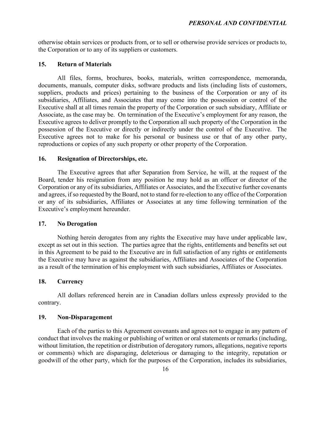 PERSONAL AND CONFIDENTIAL 16 otherwise obtain services or products from, or to sell or otherwise provide services or products to, the Corporation or to any of its suppliers or customers. 15. Return of Materials All files, forms, brochures, books, materials, written correspondence, memoranda, documents, manuals, computer disks, software products and lists (including lists of customers, suppliers, products and prices) pertaining to the business of the Corporation or any of its subsidiaries, Affiliates, and Associates that may come into the possession or control of the Executive shall at all times remain the property of the Corporation or such subsidiary, Affiliate or Associate, as the case may be. On termination of the Executive’s employment for any reason, the Executive agrees to deliver promptly to the Corporation all such property of the Corporation in the possession of the Executive or directly or indirectly under the control of the Executive. The Executive agrees not to make for his personal or business use or that of any other party, reproductions or copies of any such property or other property of the Corporation. 16. Resignation of Directorships, etc. The Executive agrees that after Separation from Service, he will, at the request of the Board, tender his resignation from any position he may hold as an officer or director of the Corporation or any of its subsidiaries, Affiliates or Associates, and the Executive further covenants and agrees, if so requested by the Board, not to stand for re-election to any office of the Corporation or any of its subsidiaries, Affiliates or Associates at any time following termination of the Executive’s employment hereunder. 17. No Derogation Nothing herein derogates from any rights the Executive may have under applicable law, except as set out in this section. The parties agree that the rights, entitlements and benefits set out in this Agreement to be paid to the Executive are in full satisfaction of any rights or entitlements the Executive may have as against the subsidiaries, Affiliates and Associates of the Corporation as a result of the termination of his employment with such subsidiaries, Affiliates or Associates. 18. Currency All dollars referenced herein are in Canadian dollars unless expressly provided to the contrary. 19. Non-Disparagement Each of the parties to this Agreement covenants and agrees not to engage in any pattern of conduct that involves the making or publishing of written or oral statements or remarks (including, without limitation, the repetition or distribution of derogatory rumors, allegations, negative reports or comments) which are disparaging, deleterious or damaging to the integrity, reputation or goodwill of the other party, which for the purposes of the Corporation, includes its subsidiaries,