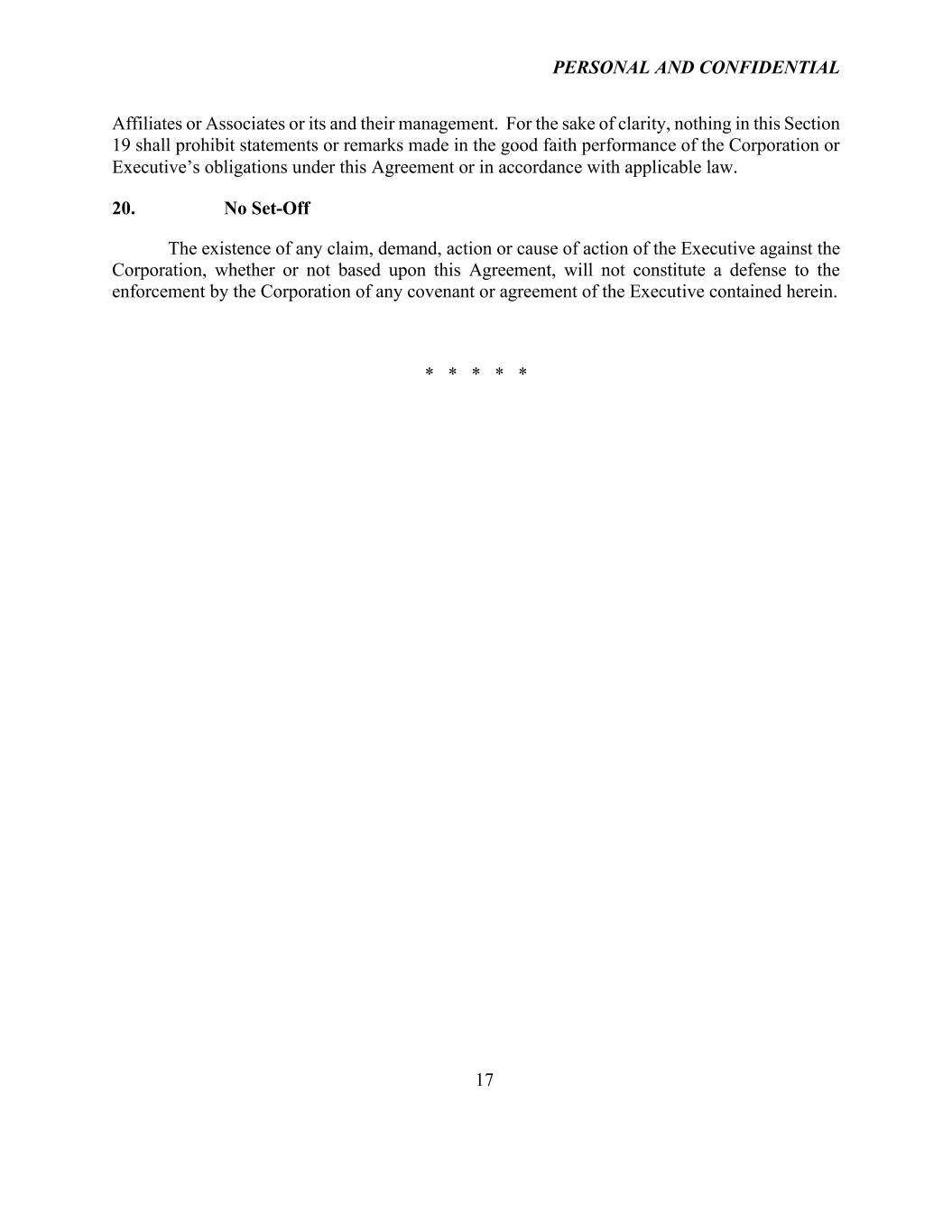 PERSONAL AND CONFIDENTIAL 17 Affiliates or Associates or its and their management. For the sake of clarity, nothing in this Section 19 shall prohibit statements or remarks made in the good faith performance of the Corporation or Executive’s obligations under this Agreement or in accordance with applicable law. 20. No Set-Off The existence of any claim, demand, action or cause of action of the Executive against the Corporation, whether or not based upon this Agreement, will not constitute a defense to the enforcement by the Corporation of any covenant or agreement of the Executive contained herein. * * * * *