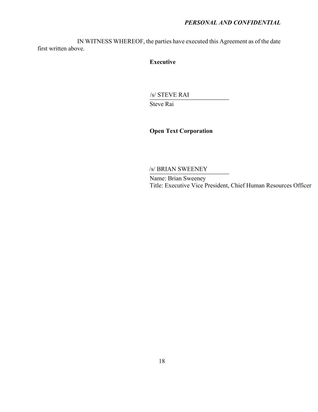 PERSONAL AND CONFIDENTIAL 18 IN WITNESS WHEREOF, the parties have executed this Agreement as of the date first written above. Executive Steve Rai Open Text Corporation /s/ STEVE RAI /s/ BRIAN SWEENEY Name: Brian Sweeney Title: Executive Vice President, Chief Human Resources Officer