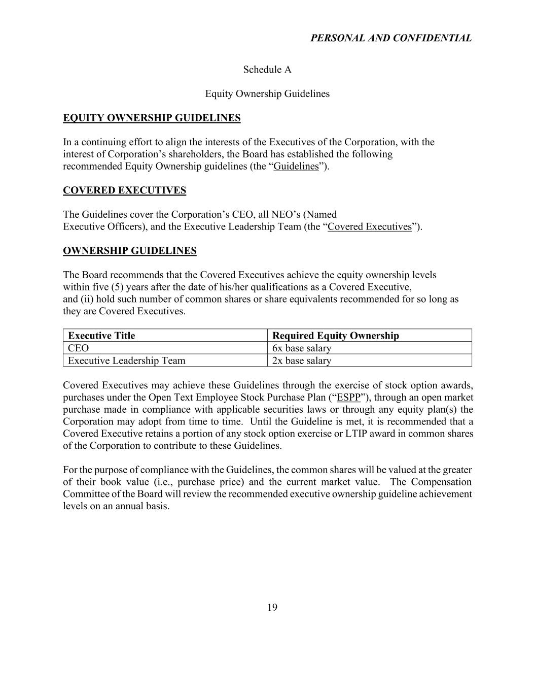 PERSONAL AND CONFIDENTIAL 19 Schedule A Equity Ownership Guidelines EQUITY OWNERSHIP GUIDELINES In a continuing effort to align the interests of the Executives of the Corporation, with the interest of Corporation’s shareholders, the Board has established the following recommended Equity Ownership guidelines (the “Guidelines”). COVERED EXECUTIVES The Guidelines cover the Corporation’s CEO, all NEO’s (Named Executive Officers), and the Executive Leadership Team (the “Covered Executives”). OWNERSHIP GUIDELINES The Board recommends that the Covered Executives achieve the equity ownership levels within five (5) years after the date of his/her qualifications as a Covered Executive, and (ii) hold such number of common shares or share equivalents recommended for so long as they are Covered Executives. Executive Title Required Equity Ownership CEO 6x base salary Executive Leadership Team 2x base salary Covered Executives may achieve these Guidelines through the exercise of stock option awards, purchases under the Open Text Employee Stock Purchase Plan (“ESPP”), through an open market purchase made in compliance with applicable securities laws or through any equity plan(s) the Corporation may adopt from time to time. Until the Guideline is met, it is recommended that a Covered Executive retains a portion of any stock option exercise or LTIP award in common shares of the Corporation to contribute to these Guidelines. For the purpose of compliance with the Guidelines, the common shares will be valued at the greater of their book value (i.e., purchase price) and the current market value. The Compensation Committee of the Board will review the recommended executive ownership guideline achievement levels on an annual basis.