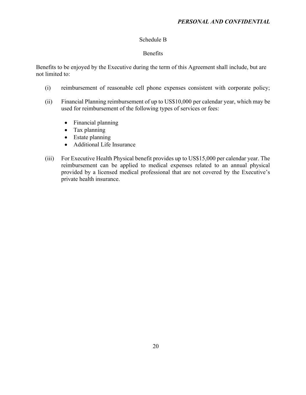 PERSONAL AND CONFIDENTIAL 20 Schedule B Benefits Benefits to be enjoyed by the Executive during the term of this Agreement shall include, but are not limited to: (i) reimbursement of reasonable cell phone expenses consistent with corporate policy; (ii) Financial Planning reimbursement of up to US$10,000 per calendar year, which may be used for reimbursement of the following types of services or fees: • Financial planning • Tax planning • Estate planning • Additional Life Insurance (iii) For Executive Health Physical benefit provides up to US$15,000 per calendar year. The reimbursement can be applied to medical expenses related to an annual physical provided by a licensed medical professional that are not covered by the Executive’s private health insurance.