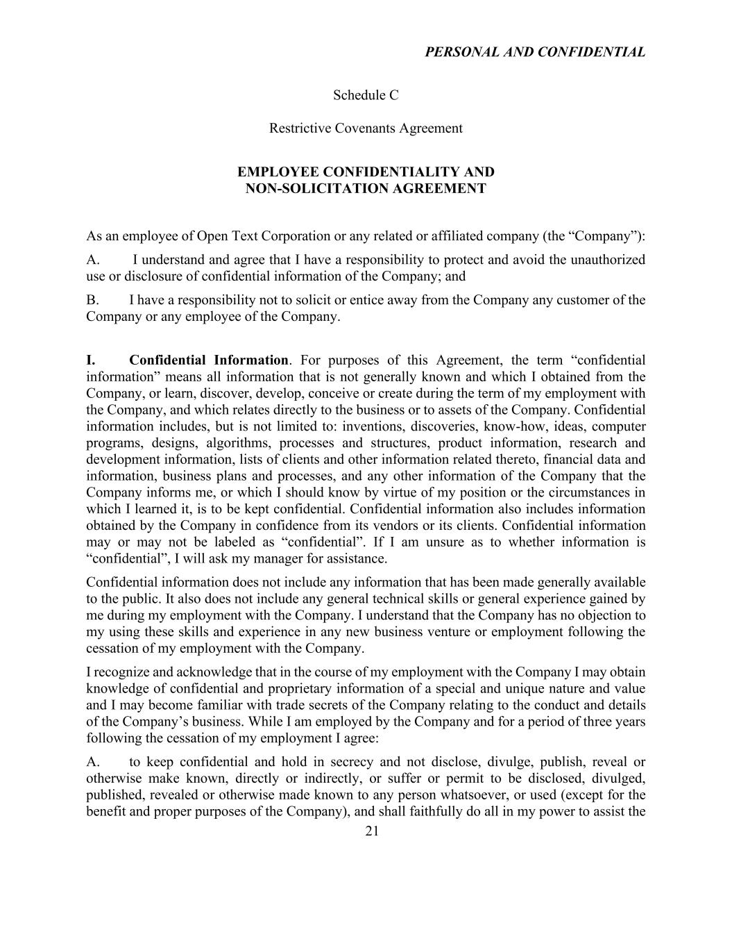 PERSONAL AND CONFIDENTIAL 21 Schedule C Restrictive Covenants Agreement EMPLOYEE CONFIDENTIALITY AND NON-SOLICITATION AGREEMENT As an employee of Open Text Corporation or any related or affiliated company (the “Company”): A. I understand and agree that I have a responsibility to protect and avoid the unauthorized use or disclosure of confidential information of the Company; and B. I have a responsibility not to solicit or entice away from the Company any customer of the Company or any employee of the Company. I. Confidential Information. For purposes of this Agreement, the term “confidential information” means all information that is not generally known and which I obtained from the Company, or learn, discover, develop, conceive or create during the term of my employment with the Company, and which relates directly to the business or to assets of the Company. Confidential information includes, but is not limited to: inventions, discoveries, know-how, ideas, computer programs, designs, algorithms, processes and structures, product information, research and development information, lists of clients and other information related thereto, financial data and information, business plans and processes, and any other information of the Company that the Company informs me, or which I should know by virtue of my position or the circumstances in which I learned it, is to be kept confidential. Confidential information also includes information obtained by the Company in confidence from its vendors or its clients. Confidential information may or may not be labeled as “confidential”. If I am unsure as to whether information is “confidential”, I will ask my manager for assistance. Confidential information does not include any information that has been made generally available to the public. It also does not include any general technical skills or general experience gained by me during my employment with the Company. I understand that the Company has no objection to my using these skills and experience in any new business venture or employment following the cessation of my employment with the Company. I recognize and acknowledge that in the course of my employment with the Company I may obtain knowledge of confidential and proprietary information of a special and unique nature and value and I may become familiar with trade secrets of the Company relating to the conduct and details of the Company’s business. While I am employed by the Company and for a period of three years following the cessation of my employment I agree: A. to keep confidential and hold in secrecy and not disclose, divulge, publish, reveal or otherwise make known, directly or indirectly, or suffer or permit to be disclosed, divulged, published, revealed or otherwise made known to any person whatsoever, or used (except for the benefit and proper purposes of the Company), and shall faithfully do all in my power to assist the
