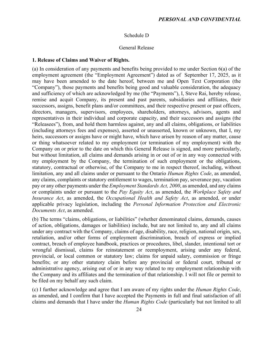 PERSONAL AND CONFIDENTIAL 24 Schedule D General Release 1. Release of Claims and Waiver of Rights. (a) In consideration of any payments and benefits being provided to me under Section 6(a) of the employment agreement (the “Employment Agreement”) dated as of September 17, 2025, as it may have been amended to the date hereof, between me and Open Text Corporation (the “Company”), those payments and benefits being good and valuable consideration, the adequacy and sufficiency of which are acknowledged by me (the “Payments”), I, Steve Rai, hereby release, remise and acquit Company, its present and past parents, subsidiaries and affiliates, their successors, assigns, benefit plans and/or committees, and their respective present or past officers, directors, managers, supervisors, employees, shareholders, attorneys, advisors, agents and representatives in their individual and corporate capacity, and their successors and assigns (the “Releasees”), from, and hold them harmless against, any and all claims, obligations, or liabilities (including attorneys fees and expenses), asserted or unasserted, known or unknown, that I, my heirs, successors or assigns have or might have, which have arisen by reason of any matter, cause or thing whatsoever related to my employment (or termination of my employment) with the Company on or prior to the date on which this General Release is signed, and more particularly, but without limitation, all claims and demands arising in or out of or in any way connected with my employment by the Company, the termination of such employment or the obligations, statutory, contractual or otherwise, of the Company to me in respect thereof, including, without limitation, any and all claims under or pursuant to the Ontario Human Rights Code, as amended, any claims, complaints or statutory entitlement to wages, termination pay, severance pay, vacation pay or any other payments under the Employment Standards Act, 2000, as amended, and any claims or complaints under or pursuant to the Pay Equity Act, as amended, the Workplace Safety and Insurance Act, as amended, the Occupational Health and Safety Act, as amended, or under applicable privacy legislation, including the Personal Information Protection and Electronic Documents Act, as amended. (b) The terms “claims, obligations, or liabilities” (whether denominated claims, demands, causes of action, obligations, damages or liabilities) include, but are not limited to, any and all claims under any contract with the Company, claims of age, disability, race, religion, national origin, sex, retaliation, and/or other forms of employment discrimination, breach of express or implied contract, breach of employee handbook, practices or procedures, libel, slander, intentional tort or wrongful dismissal, claims for reinstatement or reemployment, arising under any federal, provincial, or local common or statutory law; claims for unpaid salary, commission or fringe benefits; or any other statutory claim before any provincial or federal court, tribunal or administrative agency, arising out of or in any way related to my employment relationship with the Company and its affiliates and the termination of that relationship. I will not file or permit to be filed on my behalf any such claim. (c) I further acknowledge and agree that I am aware of my rights under the Human Rights Code, as amended, and I confirm that I have accepted the Payments in full and final satisfaction of all claims and demands that I have under the Human Rights Code (particularly but not limited to all