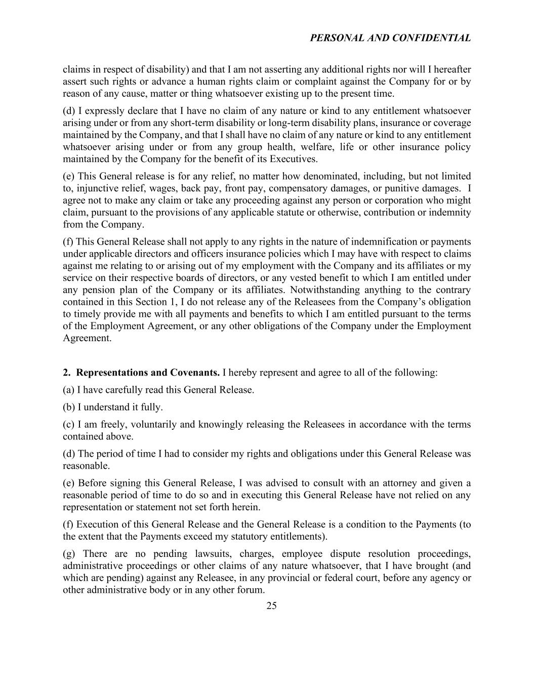 PERSONAL AND CONFIDENTIAL 25 claims in respect of disability) and that I am not asserting any additional rights nor will I hereafter assert such rights or advance a human rights claim or complaint against the Company for or by reason of any cause, matter or thing whatsoever existing up to the present time. (d) I expressly declare that I have no claim of any nature or kind to any entitlement whatsoever arising under or from any short-term disability or long-term disability plans, insurance or coverage maintained by the Company, and that I shall have no claim of any nature or kind to any entitlement whatsoever arising under or from any group health, welfare, life or other insurance policy maintained by the Company for the benefit of its Executives. (e) This General release is for any relief, no matter how denominated, including, but not limited to, injunctive relief, wages, back pay, front pay, compensatory damages, or punitive damages. I agree not to make any claim or take any proceeding against any person or corporation who might claim, pursuant to the provisions of any applicable statute or otherwise, contribution or indemnity from the Company. (f) This General Release shall not apply to any rights in the nature of indemnification or payments under applicable directors and officers insurance policies which I may have with respect to claims against me relating to or arising out of my employment with the Company and its affiliates or my service on their respective boards of directors, or any vested benefit to which I am entitled under any pension plan of the Company or its affiliates. Notwithstanding anything to the contrary contained in this Section 1, I do not release any of the Releasees from the Company’s obligation to timely provide me with all payments and benefits to which I am entitled pursuant to the terms of the Employment Agreement, or any other obligations of the Company under the Employment Agreement. 2. Representations and Covenants. I hereby represent and agree to all of the following: (a) I have carefully read this General Release. (b) I understand it fully. (c) I am freely, voluntarily and knowingly releasing the Releasees in accordance with the terms contained above. (d) The period of time I had to consider my rights and obligations under this General Release was reasonable. (e) Before signing this General Release, I was advised to consult with an attorney and given a reasonable period of time to do so and in executing this General Release have not relied on any representation or statement not set forth herein. (f) Execution of this General Release and the General Release is a condition to the Payments (to the extent that the Payments exceed my statutory entitlements). (g) There are no pending lawsuits, charges, employee dispute resolution proceedings, administrative proceedings or other claims of any nature whatsoever, that I have brought (and which are pending) against any Releasee, in any provincial or federal court, before any agency or other administrative body or in any other forum.