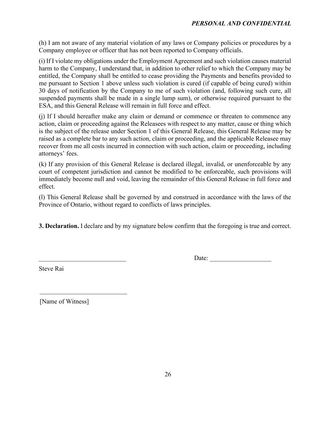 PERSONAL AND CONFIDENTIAL 26 (h) I am not aware of any material violation of any laws or Company policies or procedures by a Company employee or officer that has not been reported to Company officials. (i) If I violate my obligations under the Employment Agreement and such violation causes material harm to the Company, I understand that, in addition to other relief to which the Company may be entitled, the Company shall be entitled to cease providing the Payments and benefits provided to me pursuant to Section 1 above unless such violation is cured (if capable of being cured) within 30 days of notification by the Company to me of such violation (and, following such cure, all suspended payments shall be made in a single lump sum), or otherwise required pursuant to the ESA, and this General Release will remain in full force and effect. (j) If I should hereafter make any claim or demand or commence or threaten to commence any action, claim or proceeding against the Releasees with respect to any matter, cause or thing which is the subject of the release under Section 1 of this General Release, this General Release may be raised as a complete bar to any such action, claim or proceeding, and the applicable Releasee may recover from me all costs incurred in connection with such action, claim or proceeding, including attorneys’ fees. (k) If any provision of this General Release is declared illegal, invalid, or unenforceable by any court of competent jurisdiction and cannot be modified to be enforceable, such provisions will immediately become null and void, leaving the remainder of this General Release in full force and effect. (l) This General Release shall be governed by and construed in accordance with the laws of the Province of Ontario, without regard to conflicts of laws principles. 3. Declaration. I declare and by my signature below confirm that the foregoing is true and correct. ___________________________ Date: ___________________ Steve Rai ___________________________ [Name of Witness]