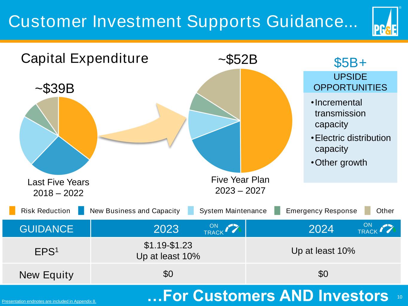 ® 27 Slide titles are hyperlinks Slide 11: Simple, Affordable Model Working 1. These numbers are illustrative approximations. 2. The Utility’s cost reduction strategies include increased efficiency and waste elimination driven by implementing the Lean operating system, improving its work management, identifying additional opportunities to improve its capital-to-expense ratio, and an improved organizational design. Factors that may cause the Utility’s actual results to differ materially from its forecasts include whether the Utility can control its operating costs within the authorized levels of spending and timely recover its costs through rates; whether the Utility can achieve projected savings; the extent to which the Utility incurs unrecoverable costs that are higher than the forecasts of such costs; and changes in cost forecasts or the scope and timing of planned work resulting from changes in customer demand for electricity and natural gas or other reasons. 3. Expected drivers of forecasted electric load growth include electrification and electric vehicle adoption. 4. Factors that may cause the Utility’s actual results to differ materially from its forecasts include the ability of PG&E Corporation and the Utility to access capital markets and other sources of debt and equity financing in a timely manner on acceptable terms; their ability to raise financing through securitization transactions; actions by credit rating agencies to downgrade PG&E Corporation’s or the Utility’s credit ratings; the supply and price of electricity, natural gas, and nuclear fuel; its use of self-insurance for wildfire liability insurance; and the impact of any changes in federal or state tax laws, policies, regulations, or their interpretation, and PG&E Corporation’s and the Utility’s ability to obtain efficient tax treatment. Slide 14: Value Proposition 1. Non-GAAP core EPS is not calculated in accordance with GAAP. See Appendix 9, Exhibit A for a reconciliation of EPS on a GAAP basis to non-GAAP core earnings per share and Appendix 9, Exhibit E regarding non-GAAP financial measures. 2. Pursuant to the Confirmation Order, PG&E Corporation agreed to not pay common dividends until it has recognized $6.2 billion in non-GAAP core earnings as described in the Plan of Reorganization after the Plan of Reorganization effective date. Subject to the foregoing restriction, any decision to declare and pay dividends in the future will be made at the discretion of the Board of Directors and will depend on, among other things, PG&E Corporation’s results of operations, financial condition, cash requirements, contractual restrictions, and other factors that the Board of Directors may deem relevant. 3. In accordance with AB 1054, $3.21 billion of fire risk mitigation capital expenditures will be excluded from the Utility's equity rate base. CAGR is from 2022 through 2027. 4. 2% reduction calculated based on the prior year's operating and maintenance costs, excluding fuel costs. Reductions available for redeployment. The Utility’s cost reduction strategies include increased efficiency driven by implementing the Lean operating system, improving its work management, identifying additional opportunities to convert expenses to capital expenditures, and an improved organizational design. Factors that may cause the Utility’s actual results to differ materially from its forecasts include whether the Utility can control its operating costs within the authorized levels of spending and timely recover its costs through rates; whether the Utility can achieve projected savings; the extent to which the Utility incurs unrecoverable costs that are higher than the forecasts of such costs; and changes in cost forecasts or the scope and timing of planned work resulting from changes in customer demand for electricity and natural gas or other reasons. 5. FFO/Debt is not calculated in accordance with GAAP. Because PG&E Corporation is not able to estimate the impact of specific line items, which have the potential to significantly impact the company’s FFO/Debt in future periods, it is not providing a reconciliation for the comparable future period FFO/Debt. Slide 15: 2023: Mitigating Risk 1. Non-GAAP core EPS is not calculated in accordance with GAAP. See Appendix 9, Exhibit A for a reconciliation of EPS on a GAAP basis to non-GAAP core earnings per share and Appendix 9, Exhibit E regarding non-GAAP financial measures. Slide 19: Appendix 1: 2023 Factors Impacting Earnings 1. Non-GAAP core EPS is not calculated in accordance with GAAP. See Appendix 9, Exhibit A for a reconciliation of EPS on a GAAP basis to non-GAAP core earnings per share, Appendix 9, Exhibit C for PG&E Corporation’s 2023 Earnings Guidance, and Appendix 9, Exhibit E regarding non-GAAP financial measures. 2. 2023 equity earning rate base reflects 2020 GRC Final Decision, 2019 GT&S Final Decision, the April 15, 2021 FERC order denying the Utility's request for rehearing related to TO18, and TO20 Formula Rate, and 2023 GRC application including the September 2022 inflation update. 3. The capital structure of an investor-owned utility is the proportional authorization of shareholders’ equity and debt that comprise a company’s long-range financing or its capitalization. The CPUC currently authorized capital structure is comprised of 47.5% long-term debt, 0.5% preferred equity, and 52% common equity. Base earnings plan assumes CPUC currently authorized return on equity and capital structure across the enterprise. 4. Refer to Appendix 9, Exhibit C: PG&E Corporation's 2023 Earnings Guidance. 5. Cash amounts for non-core items are after tax, directional, and subject to change. 6. Non-GAAP Core Earnings assumptions include: • No 2023 impacts from changes in the federal tax code; and • All potentially dilutive securities were included in the calculation of Non-GAAP Core EPS. 7. Unrecoverable interest expense includes PG&E Corporation long-term debt, Wildfire