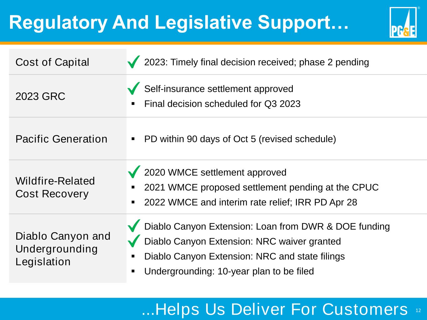® 12 Cost of Capital ▪ 2023: Timely final decision received; phase 2 pending 2023 GRC ▪ Self-insurance settlement approved ▪ Final decision scheduled for Q3 2023 Pacific Generation ▪ PD within 90 days of Oct 5 (revised schedule) Wildfire-Related Cost Recovery ▪ 2020 WMCE settlement approved ▪ 2021 WMCE proposed settlement pending at the CPUC ▪ 2022 WMCE and interim rate relief; IRR PD Apr 28 Diablo Canyon and Undergrounding Legislation ▪ Diablo Canyon Extension: Loan from DWR & DOE funding ▪ Diablo Canyon Extension: NRC waiver granted ▪ Diablo Canyon Extension: NRC and state filings ▪ Undergrounding: 10-year plan to be filed Regulatory And Legislative Support… ...Helps Us Deliver For Customers