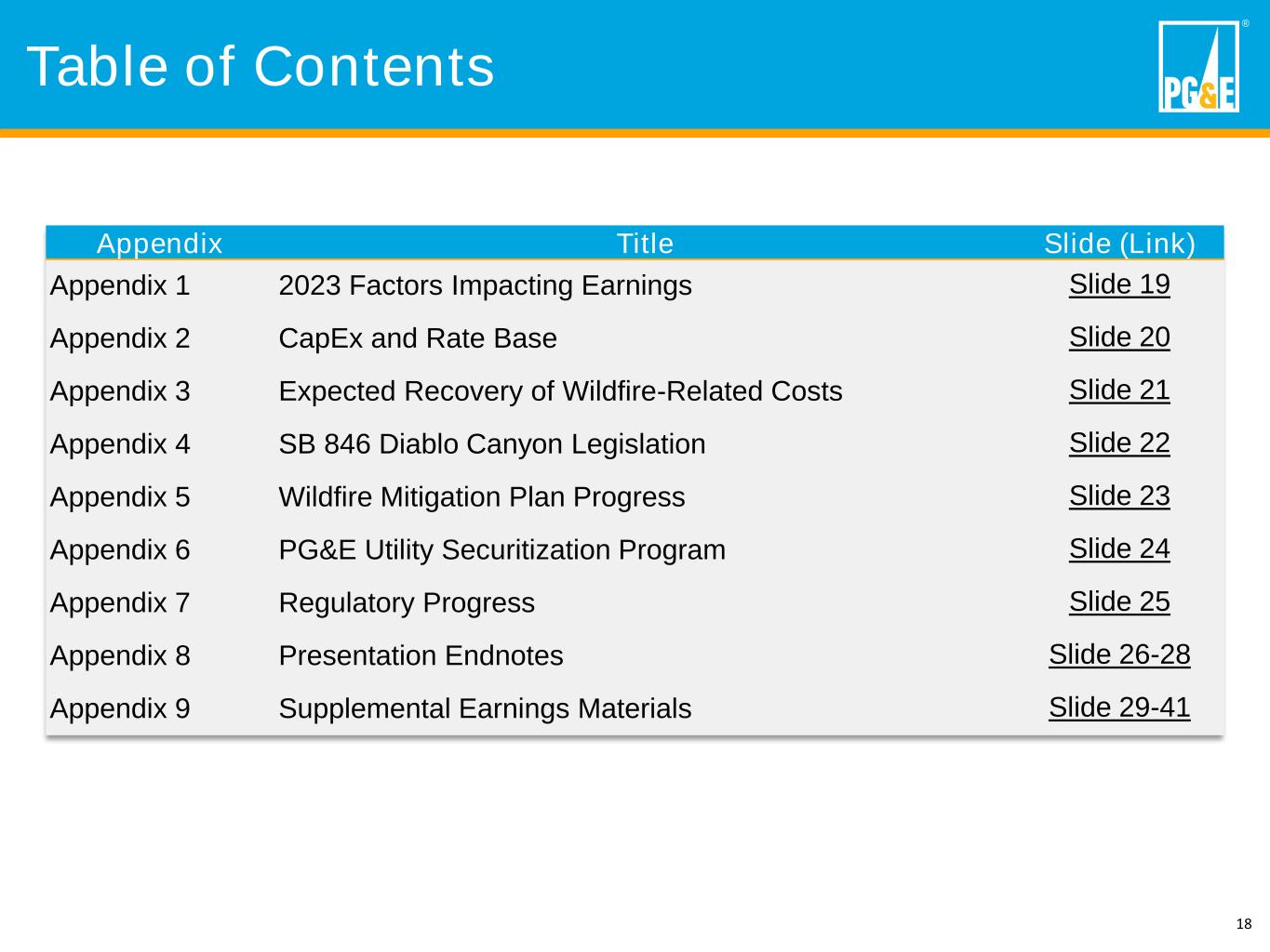 ® 18 Appendix Title Slide (Link) Appendix 1 2023 Factors Impacting Earnings Slide 19 Appendix 2 CapEx and Rate Base Slide 20 Appendix 3 Expected Recovery of Wildfire-Related Costs Slide 21 Appendix 4 SB 846 Diablo Canyon Legislation Slide 22 Appendix 5 Wildfire Mitigation Plan Progress Slide 23 Appendix 6 PG&E Utility Securitization Program Slide 24 Appendix 7 Regulatory Progress Slide 25 Appendix 8 Presentation Endnotes Slide 26-28 Appendix 9 Supplemental Earnings Materials Slide 29-41 Table of Contents