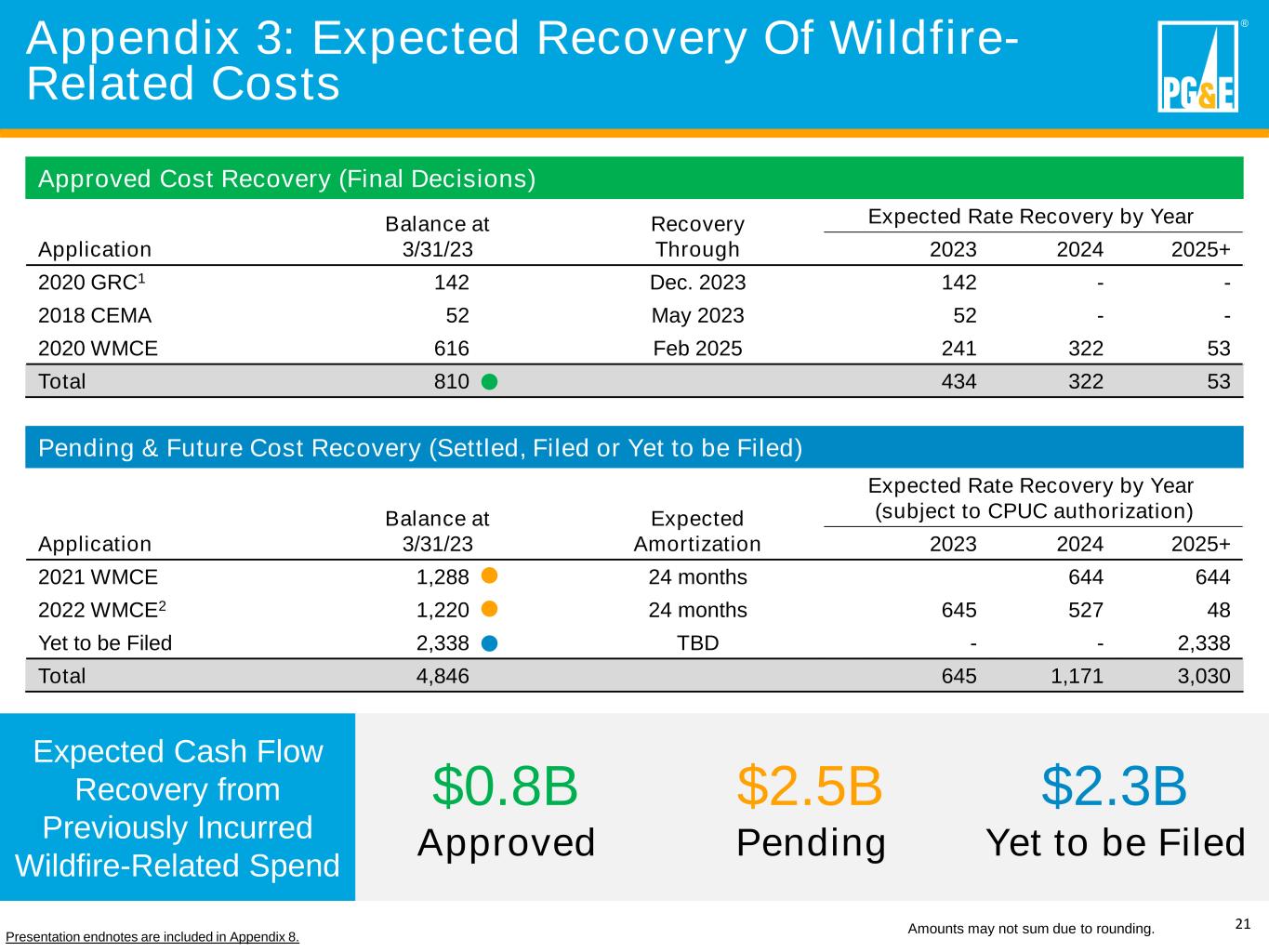 ® 21 Presentation endnotes are included in Appendix 8. Pending & Future Cost Recovery (Settled, Filed or Yet to be Filed) Application Balance at 3/31/23 Expected Amortization Expected Rate Recovery by Year (subject to CPUC authorization) 2023 2024 2025+ 2021 WMCE 1,288 24 months 644 644 2022 WMCE2 1,220 24 months 645 527 48 Yet to be Filed 2,338 TBD - - 2,338 Total 4,846 645 1,171 3,030 Appendix 3: Expected Recovery Of Wildfire- Related Costs Expected Cash Flow Recovery from Previously Incurred Wildfire-Related Spend $0.8B Approved $2.5B Pending $2.3B Yet to be Filed Approved Cost Recovery (Final Decisions) Application Balance at 3/31/23 Recovery Through Expected Rate Recovery by Year 2023 2024 2025+ 2020 GRC1 142 Dec. 2023 142 - - 2018 CEMA 52 May 2023 52 - - 2020 WMCE 616 Feb 2025 241 322 53 Total 810 434 322 53 Amounts may not sum due to rounding.
