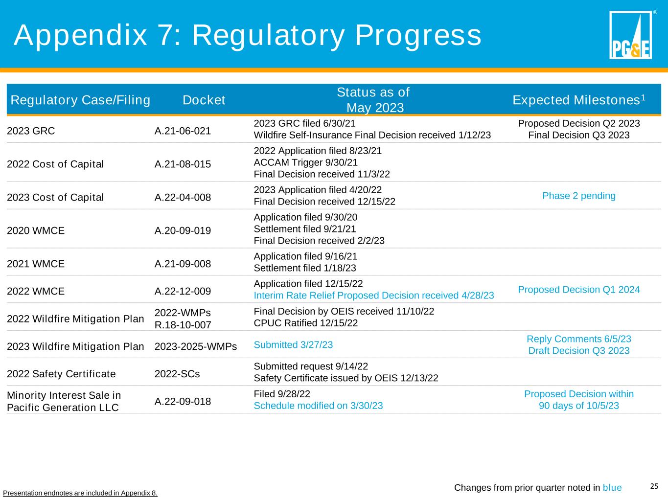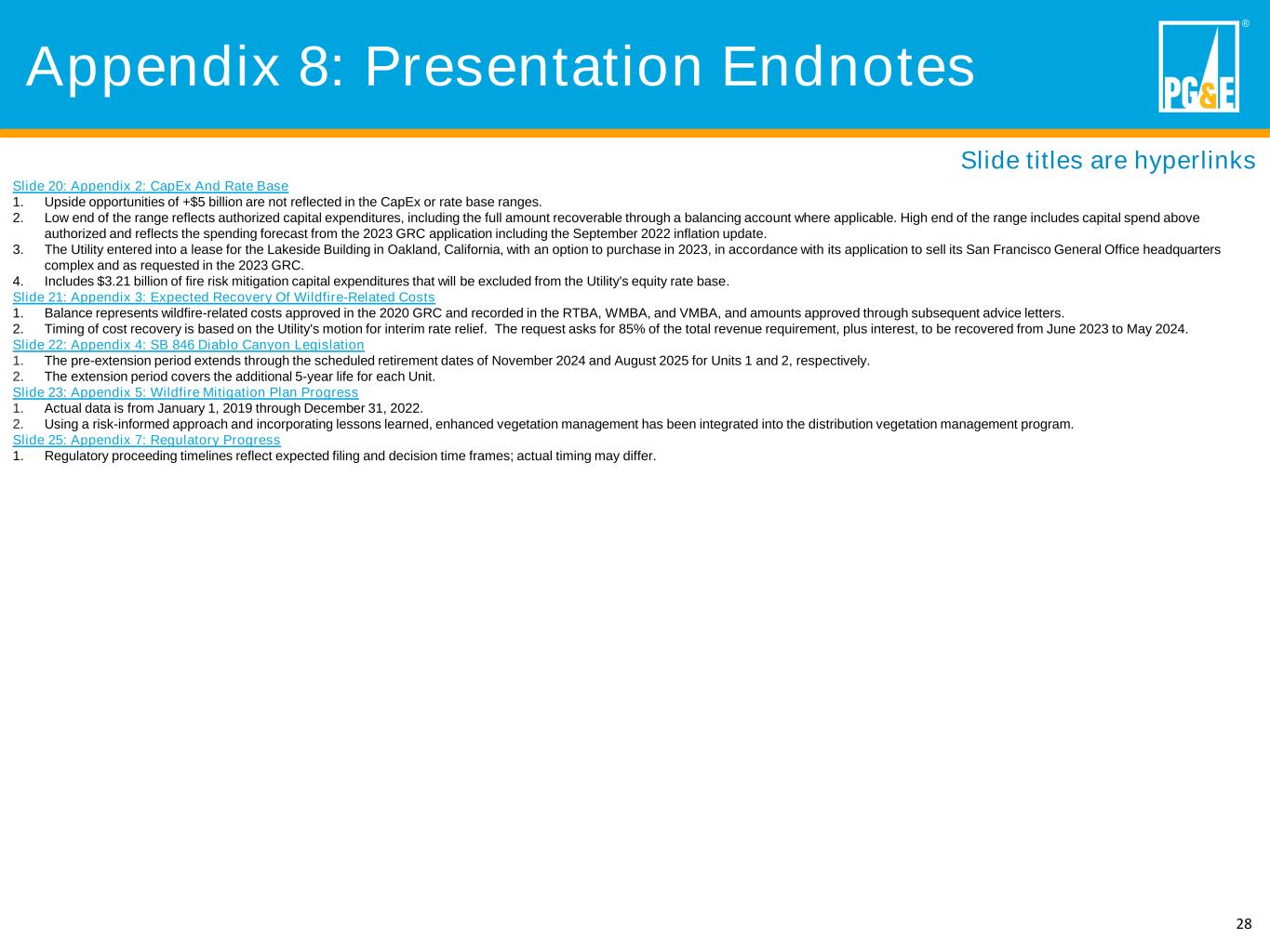 ® 28 Slide titles are hyperlinks Slide 20: Appendix 2: CapEx And Rate Base 1. Upside opportunities of +$5 billion are not reflected in the CapEx or rate base ranges. 2. Low end of the range reflects authorized capital expenditures, including the full amount recoverable through a balancing account where applicable. High end of the range includes capital spend above authorized and reflects the spending forecast from the 2023 GRC application including the September 2022 inflation update. 3. The Utility entered into a lease for the Lakeside Building in Oakland, California, with an option to purchase in 2023, in accordance with its application to sell its San Francisco General Office headquarters complex and as requested in the 2023 GRC. 4. Includes $3.21 billion of fire risk mitigation capital expenditures that will be excluded from the Utility's equity rate base. Slide 21: Appendix 3: Expected Recovery Of Wildfire-Related Costs 1. Balance represents wildfire-related costs approved in the 2020 GRC and recorded in the RTBA, WMBA, and VMBA, and amounts approved through subsequent advice letters. 2. Timing of cost recovery is based on the Utility's motion for interim rate relief. The request asks for 85% of the total revenue requirement, plus interest, to be recovered from June 2023 to May 2024. Slide 22: Appendix 4: SB 846 Diablo Canyon Legislation 1. The pre-extension period extends through the scheduled retirement dates of November 2024 and August 2025 for Units 1 and 2, respectively. 2. The extension period covers the additional 5-year life for each Unit. Slide 23: Appendix 5: Wildfire Mitigation Plan Progress 1. Actual data is from January 1, 2019 through December 31, 2022. 2. Using a risk-informed approach and incorporating lessons learned, enhanced vegetation management has been integrated into the distribution vegetation management program. Slide 25: Appendix 7: Regulatory Progress 1. Regulatory proceeding timelines reflect expected filing and decision time frames; actual timing may differ. Appendix 8: Presentation Endnotes