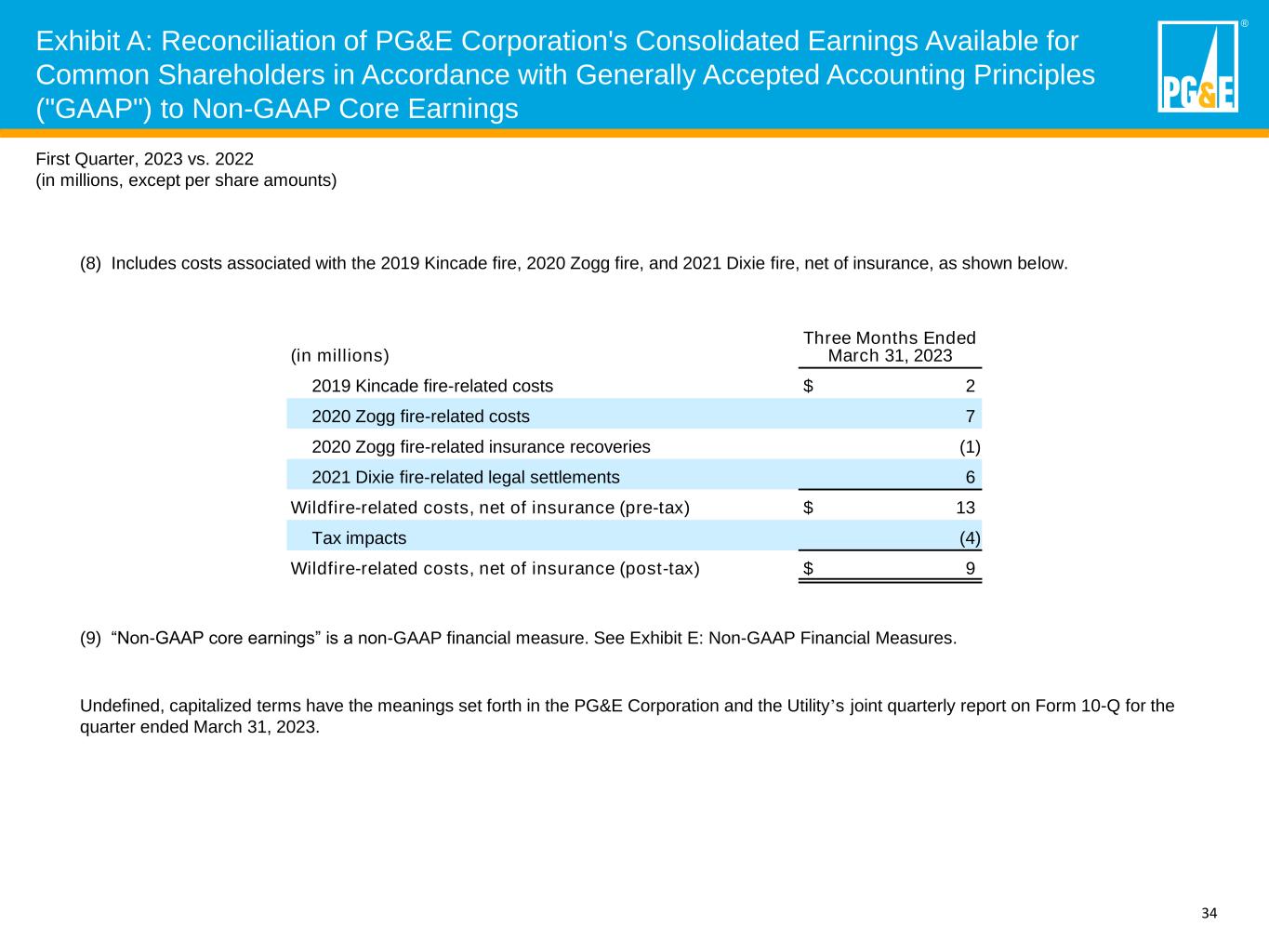® 33 First Quarter, 2023 vs. 2022 (in millions, except per share amounts) (6) Includes adjustments associated with the recovery of capital expenditures from 2011 through 2014 above amounts adopted in the 2011 GT&S rate case per the CPUC decision dated July 14, 2022. (in millions) Three Months Ended March 31, 2023 Operating model $ 2 Strategic repositioning costs (pre-tax) $ 2 Tax impacts (1) Strategic repositioning costs (post-tax) $ 1 (7) The Utility recorded one-time costs related to repositioning PG&E Corporation’s and the Utility’s operating model, including their workforce. (in millions) Three Months Ended March 31, 2023 2011-2014 GT&S capital audit $ (8) Prior period net regulatory impact (pre-tax) $ (8) Tax impacts 2 Prior period net regulatory impact (post-tax) $ (6) Exhibit A: Reconciliation of PG&E Corporation's Consolidated Earnings Available for Common Shareholders in Accordance with Generally Accepted Accounting Principles ("GAAP") to Non-GAAP Core Earnings