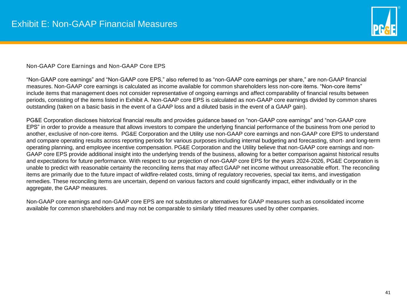 ® 41 Exhibit E: Non-GAAP Financial Measures Non-GAAP Core Earnings and Non-GAAP Core EPS “Non-GAAP core earnings” and “Non-GAAP core EPS,” also referred to as “non-GAAP core earnings per share,” are non-GAAP financial measures. Non-GAAP core earnings is calculated as income available for common shareholders less non-core items. “Non-core items” include items that management does not consider representative of ongoing earnings and affect comparability of financial results between periods, consisting of the items listed in Exhibit A. Non-GAAP core EPS is calculated as non-GAAP core earnings divided by common shares outstanding (taken on a basic basis in the event of a GAAP loss and a diluted basis in the event of a GAAP gain). PG&E Corporation discloses historical financial results and provides guidance based on “non-GAAP core earnings” and “non-GAAP core EPS” in order to provide a measure that allows investors to compare the underlying financial performance of the business from one period to another, exclusive of non-core items. PG&E Corporation and the Utility use non-GAAP core earnings and non-GAAP core EPS to understand and compare operating results across reporting periods for various purposes including internal budgeting and forecasting, short- and long-term operating planning, and employee incentive compensation. PG&E Corporation and the Utility believe that non-GAAP core earnings and non- GAAP core EPS provide additional insight into the underlying trends of the business, allowing for a better comparison against historical results and expectations for future performance. With respect to our projection of non-GAAP core EPS for the years 2024-2026, PG&E Corporation is unable to predict with reasonable certainty the reconciling items that may affect GAAP net income without unreasonable effort. The reconciling items are primarily due to the future impact of wildfire-related costs, timing of regulatory recoveries, special tax items, and investigation remedies. These reconciling items are uncertain, depend on various factors and could significantly impact, either individually or in the aggregate, the GAAP measures. Non-GAAP core earnings and non-GAAP core EPS are not substitutes or alternatives for GAAP measures such as consolidated income available for common shareholders and may not be comparable to similarly titled measures used by other companies.