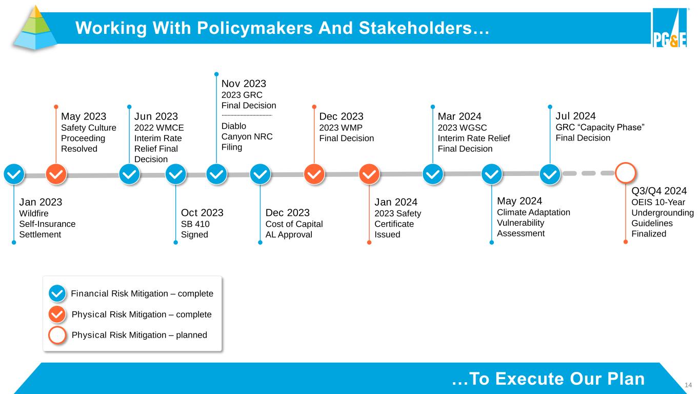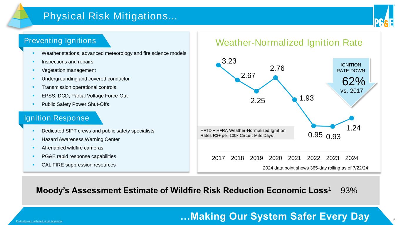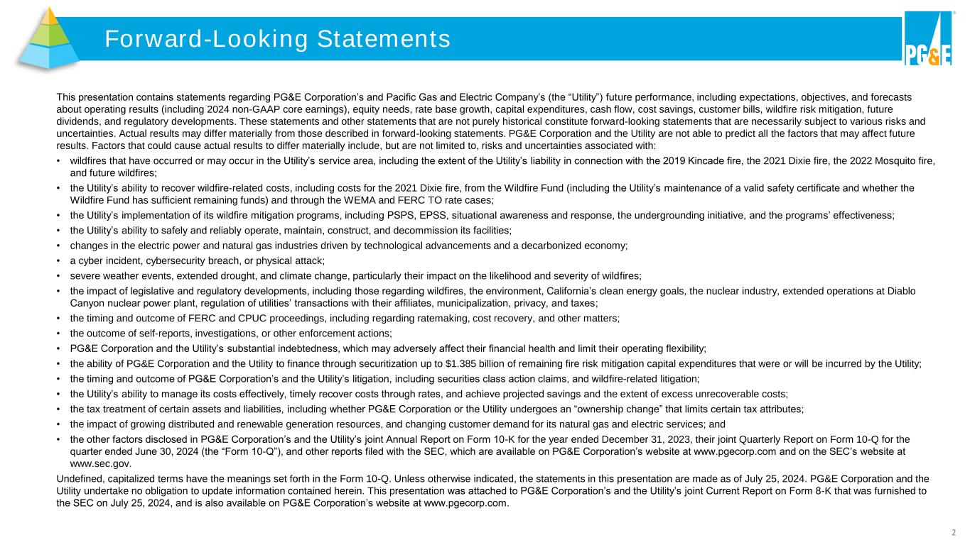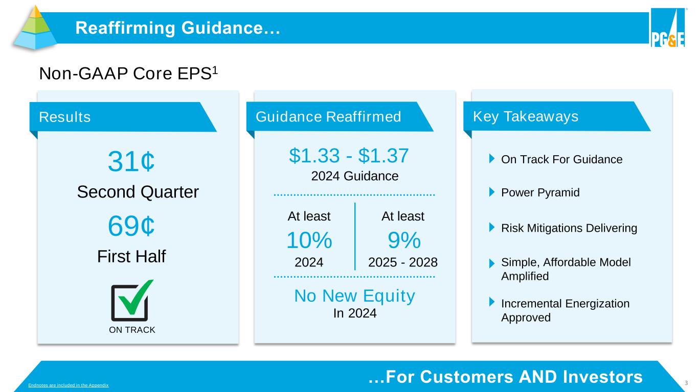 2 This presentation contains statements regarding PG&E Corporation’s and Pacific Gas and Electric Company’s (the “Utility”) future performance, including expectations, objectives, and forecasts about operating results (including 2024 non-GAAP core earnings), equity needs, rate base growth, capital expenditures, cash flow, cost savings, customer bills, wildfire risk mitigation, future dividends, and regulatory developments. These statements and other statements that are not purely historical constitute forward-looking statements that are necessarily subject to various risks and uncertainties. Actual results may differ materially from those described in forward-looking statements. PG&E Corporation and the Utility are not able to predict all the factors that may affect future results. Factors that could cause actual results to differ materially include, but are not limited to, risks and uncertainties associated with: • wildfires that have occurred or may occur in the Utility’s service area, including the extent of the Utility’s liability in connection with the 2019 Kincade fire, the 2021 Dixie fire, the 2022 Mosquito fire, and future wildfires; • the Utility’s ability to recover wildfire-related costs, including costs for the 2021 Dixie fire, from the Wildfire Fund (including the Utility’s maintenance of a valid safety certificate and whether the Wildfire Fund has sufficient remaining funds) and through the WEMA and FERC TO rate cases; • the Utility’s implementation of its wildfire mitigation programs, including PSPS, EPSS, situational awareness and response, the undergrounding initiative, and the programs’ effectiveness; • the Utility’s ability to safely and reliably operate, maintain, construct, and decommission its facilities; • changes in the electric power and natural gas industries driven by technological advancements and a decarbonized economy; • a cyber incident, cybersecurity breach, or physical attack; • severe weather events, extended drought, and climate change, particularly their impact on the likelihood and severity of wildfires; • the impact of legislative and regulatory developments, including those regarding wildfires, the environment, California’s clean energy goals, the nuclear industry, extended operations at Diablo Canyon nuclear power plant, regulation of utilities’ transactions with their affiliates, municipalization, privacy, and taxes; • the timing and outcome of FERC and CPUC proceedings, including regarding ratemaking, cost recovery, and other matters; • the outcome of self-reports, investigations, or other enforcement actions; • PG&E Corporation and the Utility’s substantial indebtedness, which may adversely affect their financial health and limit their operating flexibility; • the ability of PG&E Corporation and the Utility to finance through securitization up to $1.385 billion of remaining fire risk mitigation capital expenditures that were or will be incurred by the Utility; • the timing and outcome of PG&E Corporation’s and the Utility’s litigation, including securities class action claims, and wildfire-related litigation; • the Utility’s ability to manage its costs effectively, timely recover costs through rates, and achieve projected savings and the extent of excess unrecoverable costs; • the tax treatment of certain assets and liabilities, including whether PG&E Corporation or the Utility undergoes an “ownership change” that limits certain tax attributes; • the impact of growing distributed and renewable generation resources, and changing customer demand for its natural gas and electric services; and • the other factors disclosed in PG&E Corporation’s and the Utility’s joint Annual Report on Form 10-K for the year ended December 31, 2023, their joint Quarterly Report on Form 10-Q for the quarter ended June 30, 2024 (the “Form 10-Q”), and other reports filed with the SEC, which are available on PG&E Corporation’s website at www.pgecorp.com and on the SEC’s website at www.sec.gov. Undefined, capitalized terms have the meanings set forth in the Form 10-Q. Unless otherwise indicated, the statements in this presentation are made as of July 25, 2024. PG&E Corporation and the Utility undertake no obligation to update information contained herein. This presentation was attached to PG&E Corporation’s and the Utility’s joint Current Report on Form 8-K that was furnished to the SEC on July 25, 2024, and is also available on PG&E Corporation’s website at www.pgecorp.com. Forward-Looking Statements