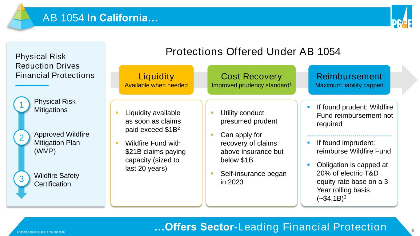 5…Making Our System Safer Every Day Physical Risk Mitigations... Endnotes are included in the Appendix HFTD + HFRA Weather-Normalized Ignition Rates R3+ per 100k Circuit Mile Days 2024 data point shows 365-day rolling as of 7/22/24 62% vs. 2017 IGNITION RATE DOWN Weather-Normalized Ignition RatePreventing Ignitions ▪ Weather stations, advanced meteorology and fire science models ▪ Inspections and repairs ▪ Vegetation management ▪ Undergrounding and covered conductor ▪ Transmission operational controls ▪ EPSS, DCD, Partial Voltage Force-Out ▪ Public Safety Power Shut-Offs ▪ Dedicated SIPT crews and public safety specialists ▪ Hazard Awareness Warning Center ▪ AI-enabled wildfire cameras ▪ PG&E rapid response capabilities ▪ CAL FIRE suppression resources Ignition Response Moody’s Assessment Estimate of Wildfire Risk Reduction Economic Loss1 93% 3.23 2.67 2.25 2.76 1.93 0.95 0.93 1.24 2017 2018 2019 2020 2021 2022 2023 2024