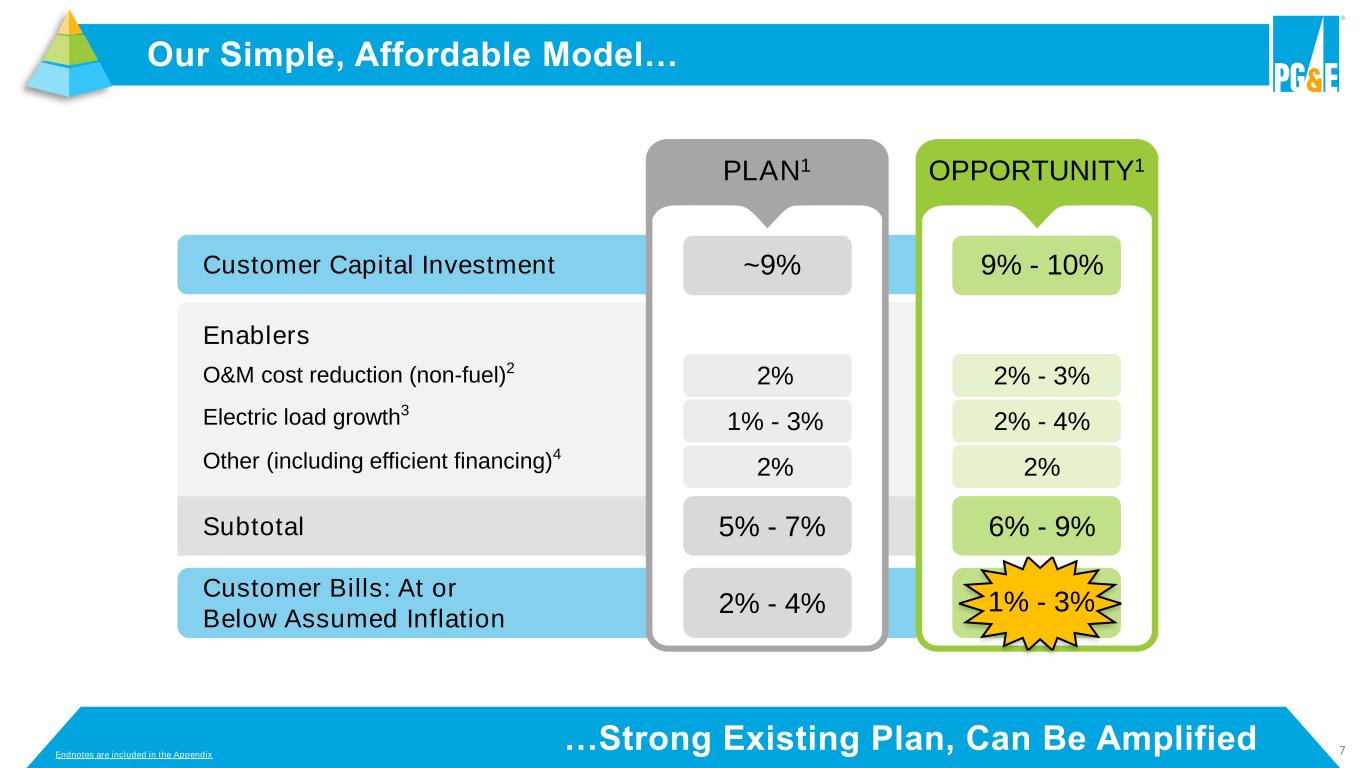 6 AB 1054 In California… Exhibit E: PG&E Corporation's 2020 and 2021 Earnings Guidance Protections Offered Under AB 1054 …Offers Sector-Leading Financial Protection ▪ Liquidity available as soon as claims paid exceed $1B2 ▪ Wildfire Fund with $21B claims paying capacity (sized to last 20 years) Liquidity Available when needed ▪ Utility conduct presumed prudent ▪ Can apply for recovery of claims above insurance but below $1B ▪ Self-insurance began in 2023 Cost Recovery Improved prudency standard1 Reimbursement Maximum liability capped ▪ If found prudent: Wildfire Fund reimbursement not required ▪ If found imprudent: reimburse Wildfire Fund ▪ Obligation is capped at 20% of electric T&D equity rate base on a 3 Year rolling basis (~$4.1B)3 Physical Risk Reduction Drives Financial Protections 1 Physical Risk Mitigations 2 Approved Wildfire Mitigation Plan (WMP) 3 Wildfire Safety Certification Endnotes are included in the Appendix