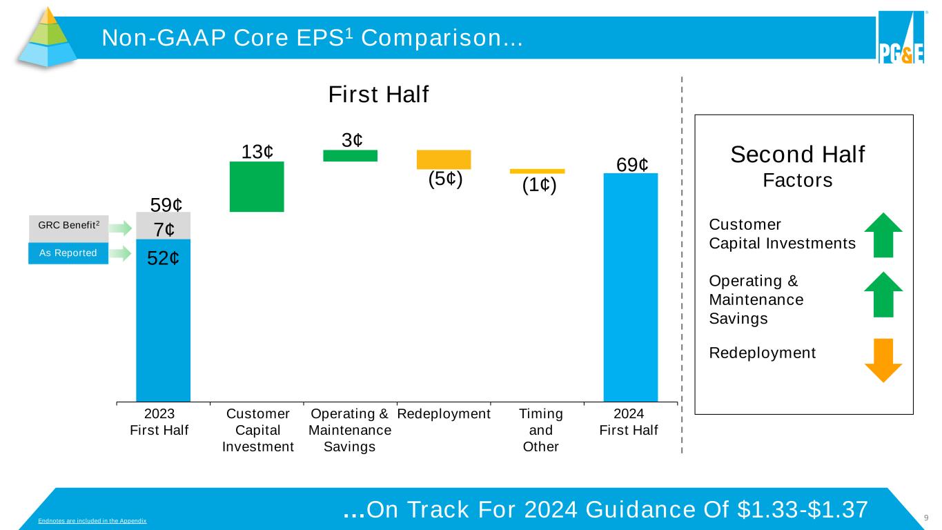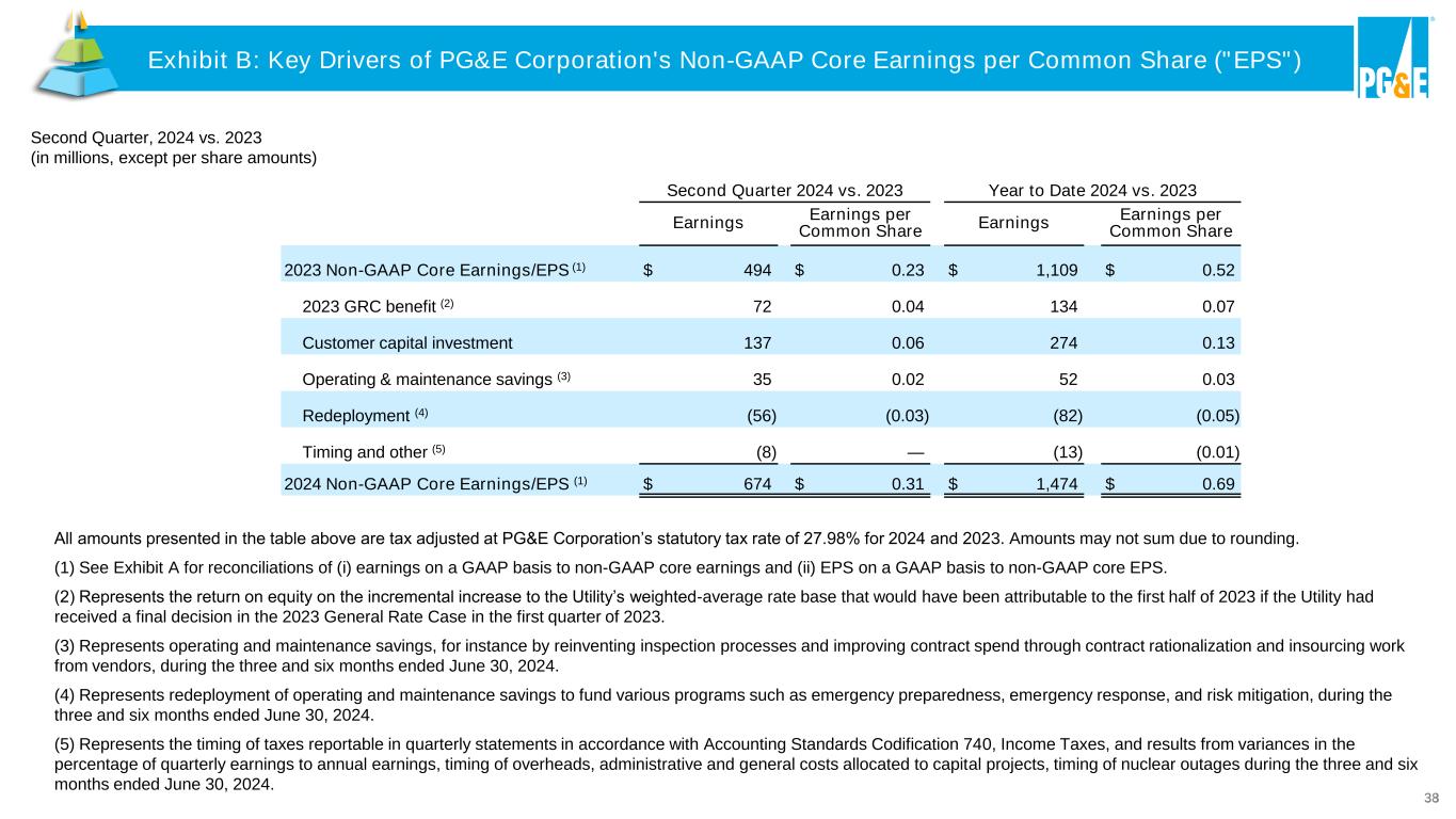 38 All amounts presented in the table above are tax adjusted at PG&E Corporation’s statutory tax rate of 27.98% for 2024 and 2023. Amounts may not sum due to rounding. (1) See Exhibit A for reconciliations of (i) earnings on a GAAP basis to non-GAAP core earnings and (ii) EPS on a GAAP basis to non-GAAP core EPS. (2) Represents the return on equity on the incremental increase to the Utility’s weighted-average rate base that would have been attributable to the first half of 2023 if the Utility had received a final decision in the 2023 General Rate Case in the first quarter of 2023. (3) Represents operating and maintenance savings, for instance by reinventing inspection processes and improving contract spend through contract rationalization and insourcing work from vendors, during the three and six months ended June 30, 2024. (4) Represents redeployment of operating and maintenance savings to fund various programs such as emergency preparedness, emergency response, and risk mitigation, during the three and six months ended June 30, 2024. (5) Represents the timing of taxes reportable in quarterly statements in accordance with Accounting Standards Codification 740, Income Taxes, and results from variances in the percentage of quarterly earnings to annual earnings, timing of overheads, administrative and general costs allocated to capital projects, timing of nuclear outages during the three and six months ended June 30, 2024. Second Quarter 2024 vs. 2023 Year to Date 2024 vs. 2023 Earnings Earnings per Common Share Earnings Earnings per Common Share 2023 Non-GAAP Core Earnings/EPS (1) $ 494 $ 0.23 $ 1,109 $ 0.52 2023 GRC benefit (2) 72 0.04 134 0.07 Customer capital investment 137 0.06 274 0.13 Operating & maintenance savings (3) 35 0.02 52 0.03 Redeployment (4) (56) (0.03) (82) (0.05) Timing and other (5) (8) — (13) (0.01) 2024 Non-GAAP Core Earnings/EPS (1) $ 674 $ 0.31 $ 1,474 $ 0.69 Second Quarter, 2024 vs. 2023 (in millions, except per share amounts) Exhibit B: Key Drivers of PG&E Corporation's Non-GAAP Core Earnings per Common Share ("EPS") Exhibit B: Key Drivers of PG&E Corporation's Non-GAAP Core Earnings per Common Share ("EPS")