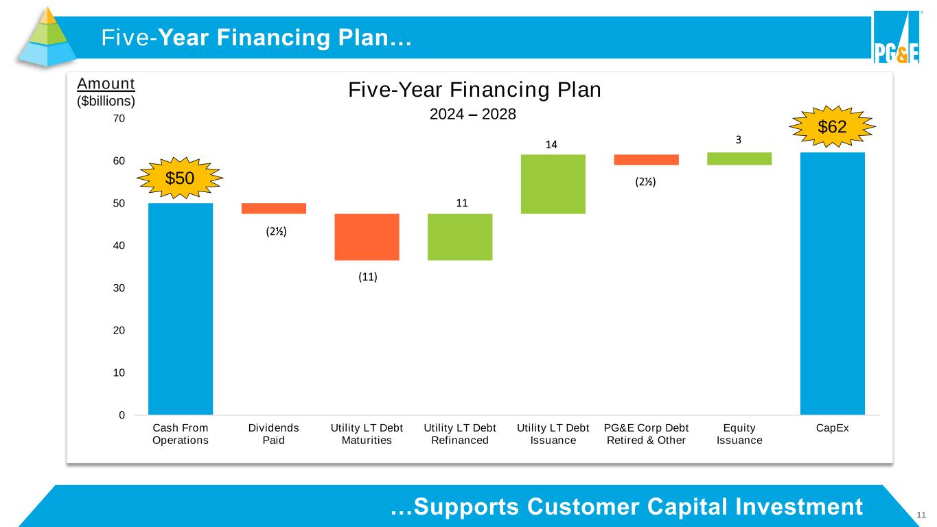 10…Benefits Customers And Supports Growth Five-Year $62B Capital Plan… Plus At Least Customer Beneficial Investment Opportunities4 Transportation Electrification Capacity Investments Transmission Upgrades: Data Centers and System Investments Incremental New Business Connections Hydro and Storage IT and Automation $5B CPUC FERC ~9.5% CAGR 2023-2028 11 11 12 13 14 15 46 52 56 60 68 75 57 63 68 73 82 90 2023A 2024F 2025F 2026F 2027F 2028F % Already Authorized2 93% 92% 85% 81%94% Weighted Average Rate Base ($B)1 $62B 2024-2028 1.4 1.5 2.1 1.8 1.8 1.9 8.4 8.8 10.6 9.7 11.8 12.1 9.8 10.4 12.7 11.5 13.6 14.0 2023A 2024F 2025F 2026F 2027F 2028F CPUC FERC CapEx ($B)3 Endnotes are included in the Appendix