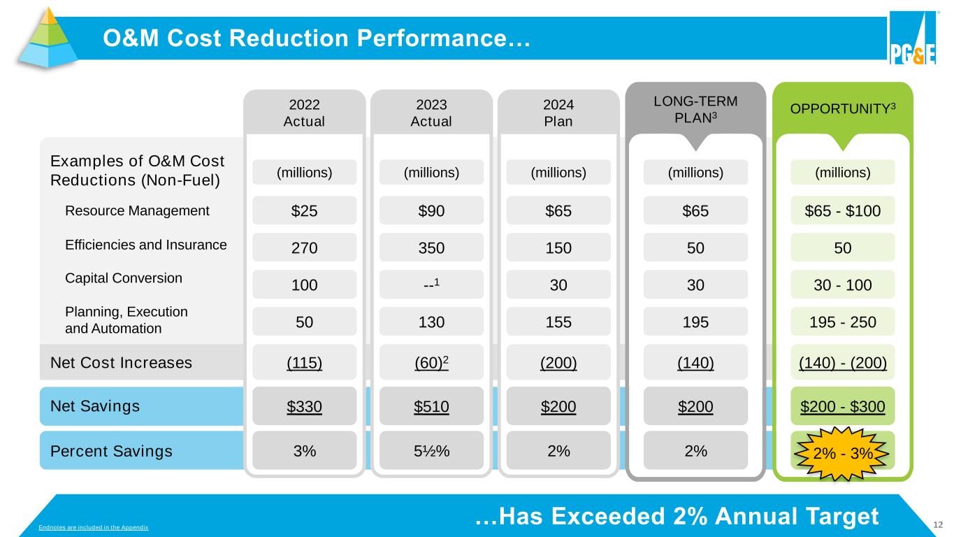 11…Supports Customer Capital Investment Five-Year Financing Plan… (2½) (11) 11 14 (2½) 3 0 10 20 30 40 50 60 70 Cash From Operations Dividends Paid Utility LT Debt Maturities Utility LT Debt Refinanced Utility LT Debt Issuance PG&E Corp Debt Retired & Other Equity Issuance CapEx Amount ($billions) 2024 – 2028 Five-Year Financing Plan $50 $62