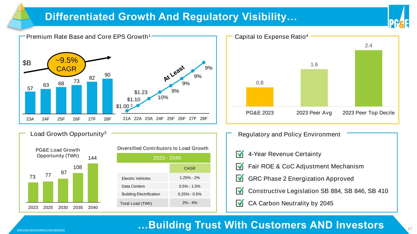 16…Benefits Customers AND Investors Differentiated Performance… Endnotes are included in the Appendix 2022A 2023A 2024F Future Customer Investment Rate Base Growth 5.5% 14.5% 10.5% CA Regulatory Ranking (RRA) Average/2 Average/1 Above Average Affordable Model Non-Fuel O&M Reduction1 3% 2% Load Growth2 Bills3 Credit Ratings BB-/Ba2 BB- /Ba2 BB/Ba1 Consistent Performance Non-GAAP Core EPS Growth4 10% 12% Operating Cashflow $3.7B $4.7B $8.3B $10B+ Performance Playbook Enterprise Lean Maturity N/A 44% 51% 80% Risk Reduction Safety Certification Valid through 1/22/25 Financial S&P 500 / Rate Neutral Securitization Common Dividend / Fire Victim Trust Exit 2% - 4%1 - 3 2% - 4% Investment Grade & Mid-teens FFO/Debt Premium Multiple 5½% 2% At Least 10% At Least 9% 2025 - 2028