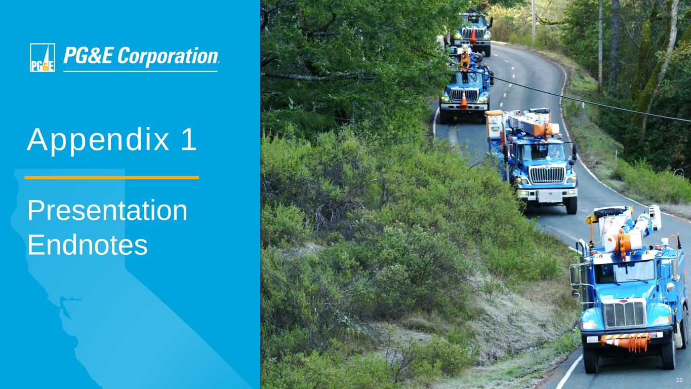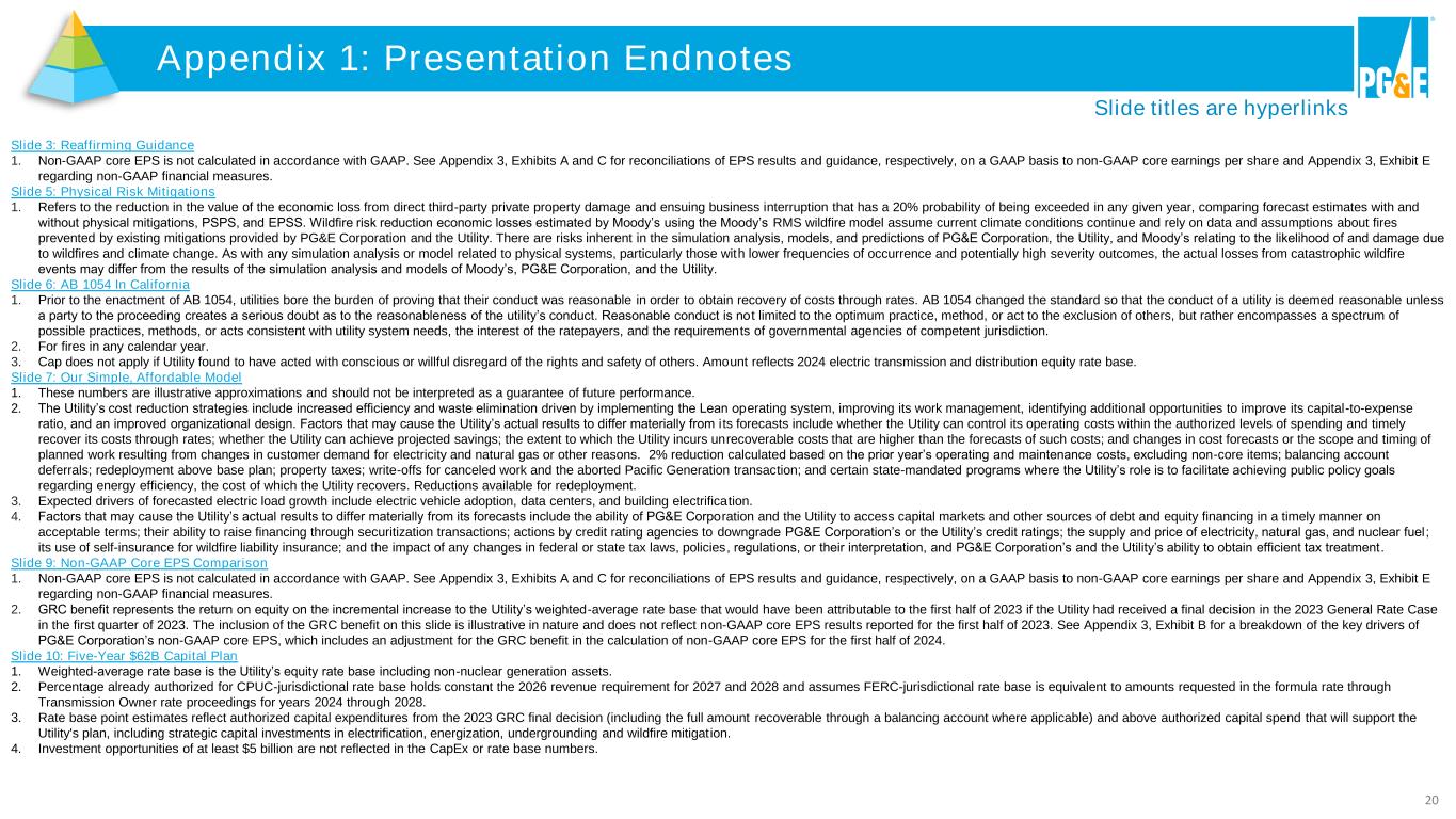 20 Appendix 1: Presentation Endnotes Slide 3: Reaffirming Guidance 1. Non-GAAP core EPS is not calculated in accordance with GAAP. See Appendix 3, Exhibits A and C for reconciliations of EPS results and guidance, respectively, on a GAAP basis to non-GAAP core earnings per share and Appendix 3, Exhibit E regarding non-GAAP financial measures. Slide 5: Physical Risk Mitigations 1. Refers to the reduction in the value of the economic loss from direct third-party private property damage and ensuing business interruption that has a 20% probability of being exceeded in any given year, comparing forecast estimates with and without physical mitigations, PSPS, and EPSS. Wildfire risk reduction economic losses estimated by Moody’s using the Moody’s RMS wildfire model assume current climate conditions continue and rely on data and assumptions about fires prevented by existing mitigations provided by PG&E Corporation and the Utility. There are risks inherent in the simulation analysis, models, and predictions of PG&E Corporation, the Utility, and Moody’s relating to the likelihood of and damage due to wildfires and climate change. As with any simulation analysis or model related to physical systems, particularly those with lower frequencies of occurrence and potentially high severity outcomes, the actual losses from catastrophic wildfire events may differ from the results of the simulation analysis and models of Moody’s, PG&E Corporation, and the Utility. Slide 6: AB 1054 In California 1. Prior to the enactment of AB 1054, utilities bore the burden of proving that their conduct was reasonable in order to obtain recovery of costs through rates. AB 1054 changed the standard so that the conduct of a utility is deemed reasonable unless a party to the proceeding creates a serious doubt as to the reasonableness of the utility’s conduct. Reasonable conduct is not limited to the optimum practice, method, or act to the exclusion of others, but rather encompasses a spectrum of possible practices, methods, or acts consistent with utility system needs, the interest of the ratepayers, and the requirements of governmental agencies of competent jurisdiction. 2. For fires in any calendar year. 3. Cap does not apply if Utility found to have acted with conscious or willful disregard of the rights and safety of others. Amount reflects 2024 electric transmission and distribution equity rate base. Slide 7: Our Simple, Affordable Model 1. These numbers are illustrative approximations and should not be interpreted as a guarantee of future performance. 2. The Utility’s cost reduction strategies include increased efficiency and waste elimination driven by implementing the Lean operating system, improving its work management, identifying additional opportunities to improve its capital-to-expense ratio, and an improved organizational design. Factors that may cause the Utility’s actual results to differ materially from i ts forecasts include whether the Utility can control its operating costs within the authorized levels of spending and timely recover its costs through rates; whether the Utility can achieve projected savings; the extent to which the Utility incurs unrecoverable costs that are higher than the forecasts of such costs; and changes in cost forecasts or the scope and timing of planned work resulting from changes in customer demand for electricity and natural gas or other reasons. 2% reduction calculated based on the prior year’s operating and maintenance costs, excluding non-core items; balancing account deferrals; redeployment above base plan; property taxes; write-offs for canceled work and the aborted Pacific Generation transaction; and certain state-mandated programs where the Utility’s role is to facilitate achieving public policy goals regarding energy efficiency, the cost of which the Utility recovers. Reductions available for redeployment. 3. Expected drivers of forecasted electric load growth include electric vehicle adoption, data centers, and building electrification. 4. Factors that may cause the Utility’s actual results to differ materially from its forecasts include the ability of PG&E Corporation and the Utility to access capital markets and other sources of debt and equity financing in a timely manner on acceptable terms; their ability to raise financing through securitization transactions; actions by credit rating agencies to downgrade PG&E Corporation’s or the Utility’s credit ratings; the supply and price of electricity, natural gas, and nuclear fuel ; its use of self-insurance for wildfire liability insurance; and the impact of any changes in federal or state tax laws, policies , regulations, or their interpretation, and PG&E Corporation’s and the Utility’s ability to obtain efficient tax treatment. Slide 9: Non-GAAP Core EPS Comparison 1. Non-GAAP core EPS is not calculated in accordance with GAAP. See Appendix 3, Exhibits A and C for reconciliations of EPS results and guidance, respectively, on a GAAP basis to non-GAAP core earnings per share and Appendix 3, Exhibit E regarding non-GAAP financial measures. 2. GRC benefit represents the return on equity on the incremental increase to the Utility’s weighted-average rate base that would have been attributable to the first half of 2023 if the Utility had received a final decision in the 2023 General Rate Case in the first quarter of 2023. The inclusion of the GRC benefit on this slide is illustrative in nature and does not reflect non-GAAP core EPS results reported for the first half of 2023. See Appendix 3, Exhibit B for a breakdown of the key drivers of PG&E Corporation’s non-GAAP core EPS, which includes an adjustment for the GRC benefit in the calculation of non-GAAP core EPS for the first half of 2024. Slide 10: Five-Year $62B Capital Plan 1. Weighted-average rate base is the Utility’s equity rate base including non-nuclear generation assets. 2. Percentage already authorized for CPUC-jurisdictional rate base 
