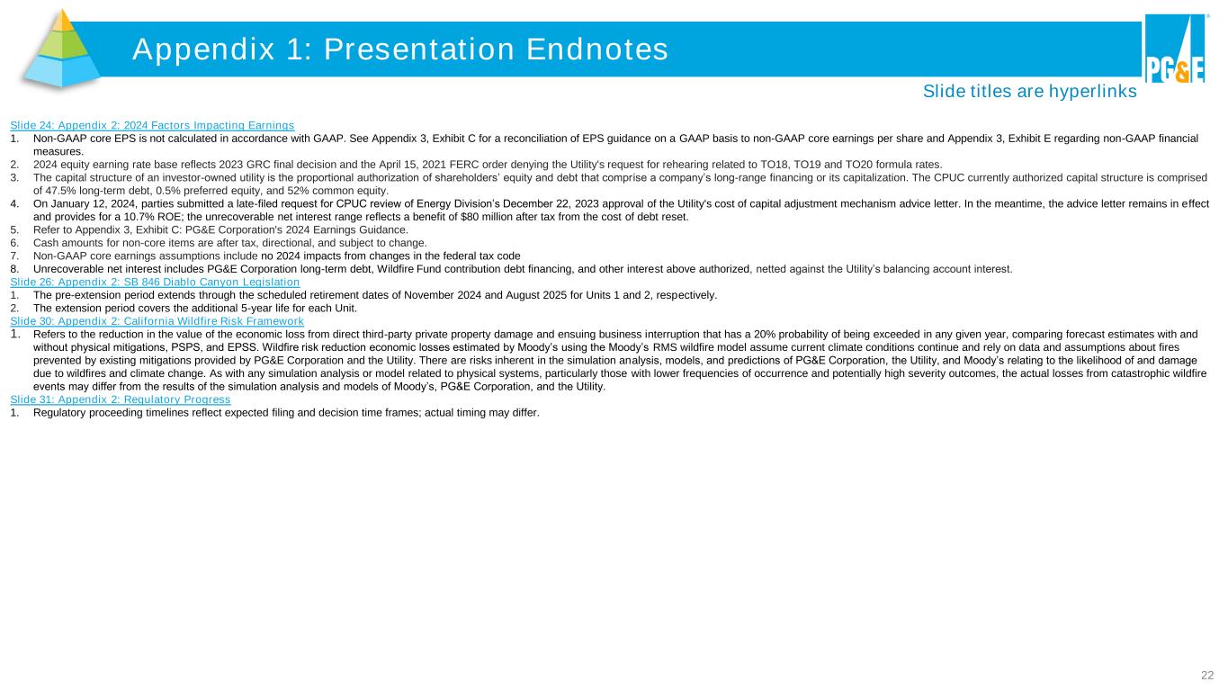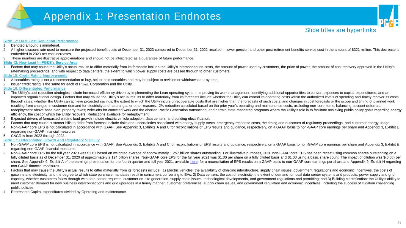 21 Appendix 1: Presentation Endnotes Slide titles are hyperlinks Slide 12: O&M Cost Reduction Performance 1. Denoted amount is immaterial. 2. A higher discount rate used to measure the projected benefit costs at December 31, 2023 compared to December 31, 2022 resulted in lower pension and other post-retirement benefits service cost in the amount of $321 million. This decrease is embedded in 2023 net cost increases. 3. These numbers are illustrative approximations and should not be interpreted as a guarantee of future performance. Slide 13: New Load In PG&E’s Service Area 1. Factors that may cause the Utility’s actual results to differ materially from its forecasts include the Utility's interconnection costs, the amount of power used by customers, the price of power, the amount of cost recovery approved in the Utility's ratemaking proceedings, and with respect to data centers, the extent to which power supply costs are passed through to other customers. Slide 15: Credit Rating Improvements 1. A securities rating is not a recommendation to buy, sell or hold securities and may be subject to revision or withdrawal at any time. 2. Issuer credit rating is the same for each of PG&E Corporation and the Utility. Slide 16: Differentiated Performance 1. The Utility’s cost reduction strategies include increased efficiency driven by implementing the Lean operating system, improving its work management, identifying additional opportunities to convert expenses to capital expenditures, and an improved organizational design. Factors that may cause the Utility’s actual results to differ materially from its forecasts include whether the Utility can control its operating costs within the authorized levels of spending and timely recover its costs through rates; whether the Utility can achieve projected savings; the extent to which the Utility incurs unrecoverable costs that are higher than the forecasts of such costs; and changes in cost forecasts or the scope and timing of planned work resulting from changes in customer demand for electricity and natural gas or other reasons. 2% reduction calculated based on the prior year’s operating and maintenance costs, excluding non-core items; balancing account deferrals; redeployment above base plan; property taxes; write-offs for canceled work and the aborted Pacific Generation transaction; and certain state-mandated programs where the Utility’s role is to facilitate achieving public policy goals regarding energy efficiency, the cost of which the Utility recovers. Reductions available for redeployment. 2. Expected drivers of forecasted electric load growth include electric vehicle adoption, data centers, and building electrification. 3. Factors that may cause customer bills to differ from forecast include risks and uncertainties associated with energy supply costs, emergency response costs, the timing and outcomes of regulatory proceedings, and customer energy usage. 4. Non-GAAP core EPS is not calculated in accordance with GAAP. See Appendix 3, Exhibits A and C for reconciliations of EPS results and guidance, respectively, on a GAAP basis to non-GAAP core earnings per share and Appendix 3, Exhibit E regarding non-GAAP financial measures. 5. CAGR is from 2023 through 2028. Slide 17: Differentiated Growth And Regulatory Visibility 1. Non-GAAP core EPS is not calculated in accordance with GAAP. See Appendix 3, Exhibits A and C for reconciliations of EPS results and guidance, respectively, on a GAAP basis to non-GAAP core earnings per share and Appendix 3, Exhibit E regarding non-GAAP financial measures. 2. Non-GAAP core EPS for the full year 2020 was $1.61 based on weighted average of approximately 1.257 billion shares outstanding. For illustrative purposes, 2020 non-GAAP core EPS has been recast using common shares outstanding on a fully diluted basis as of December 31, 2020 of approximately 2.124 billion shares. Non-GAAP core EPS for the full year 2021 was $1.00 per share on a fully diluted basis and $1.08 using a basic share count. The impact of dilution was $(0.08) per share. See Appendix 9, Exhibit A of the earnings presentation for the fourth quarter and full year 2021, available here, for a reconciliation of EPS results on a GAAP basis to non-GAAP core earnings per share and Appendix 9, Exhibit H regarding non-GAAP financial measures. 3. Factors that may cause the Utility’s actual results to differ materially from its forecasts include: 1) Electric vehicles: the availability of charging infrastructure, supply chain issues, government regulations and economic incentives, the costs of gasoline and electricity, and the degree to which state purchase mandates result in consumers converting to EVs; 2) Data centers: the cost of electricity, the extent of demand for local data center systems and products, power supply and grid capacity, whether customers follow through with data center requests, customer on-site generation, supply chain issues, technological developments, and government regulations and permitting; and 3) Building electrification: the Utility’s ability to meet customer demand for new business interconnections and grid upgrades in a timely manner, customer preferences, supply chain issues, and government regulation and economic incentives, including the success of litigation challenging public policies. 4. Represents Capital expenditures divided by Operating and maintenance.