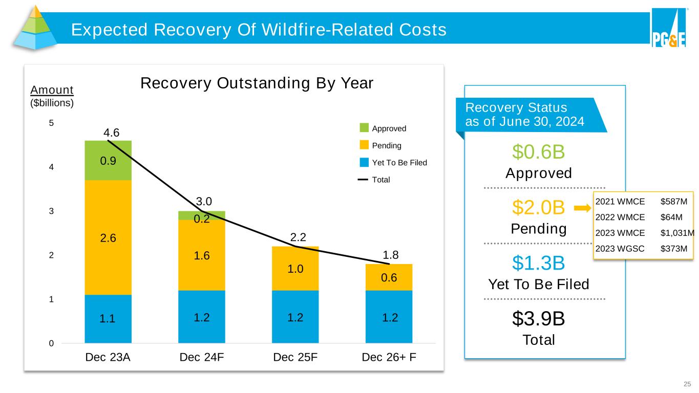 24 2024 Factors Impacting Earnings Endnotes are included in the Appendix Changes from prior quarter noted in blue text $1.33 - $1.37 Non-GAAP Core EPS1 New Equity in 2024 $0 Key Ranges Weighted Average Rate Base2 CPUC $52B FERC $11B Total Rate Base $63B Equity Ratio:3 52% Return on Equity:3 10.7%4 Non-Core Items5 Key Factors Affecting Non-GAAP Core Earnings7 ($ millions after tax) Estimated non-core items guidance $425 - $460 Non-core items cash portion6 $290 ($ millions after tax) Unrecoverable net interest8 $285 - $365 Other earnings factors including AFUDC equity, incentive revenues, tax benefits, and cost savings, net of below-the-line costs