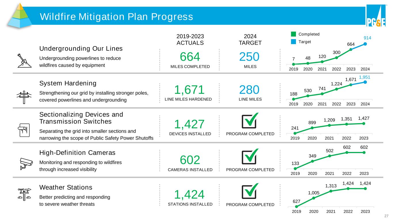 26 SB 846 Diablo Canyon Legislation Cost Recovery 2022-20241 2025-20302 ▪ Ongoing O&M and rate base recovery through the GRC ▪ $1.4B in state funding available to support extended operations • $1.1B in extension costs; to be reimbursed from DOE Civil Nuclear Credit program • Up to $300M available to invest in business through a $7/MWh transition fee starting 9/2/22 ▪ $100M/year in lieu of traditional rate base return ▪ Annual automatic true-up mechanism for costs ▪ $13/MWh performance fee upside to be deployed for customer benefit Pre-Extension Period Extension Period 9/2/22 Governor Newsom signed SB 846 1/11/24 Finalized terms with DOE for up to $1.1B via the Civil Nuclear Credit Program 10/18/22 Executed $1.4B loan agreement with DWR 3/2/23 NRC approved exemption request allowing continued operations at DCPP 11/7/23 Filed for NRC license renewal 12/14/23 CPUC final decision conditionally approving extended operations 12/19/23 NRC determined license renewal application sufficient 6/25 NRC Environmental Impact Statement and Safety Evaluation Report Endnotes are included in the Appendix