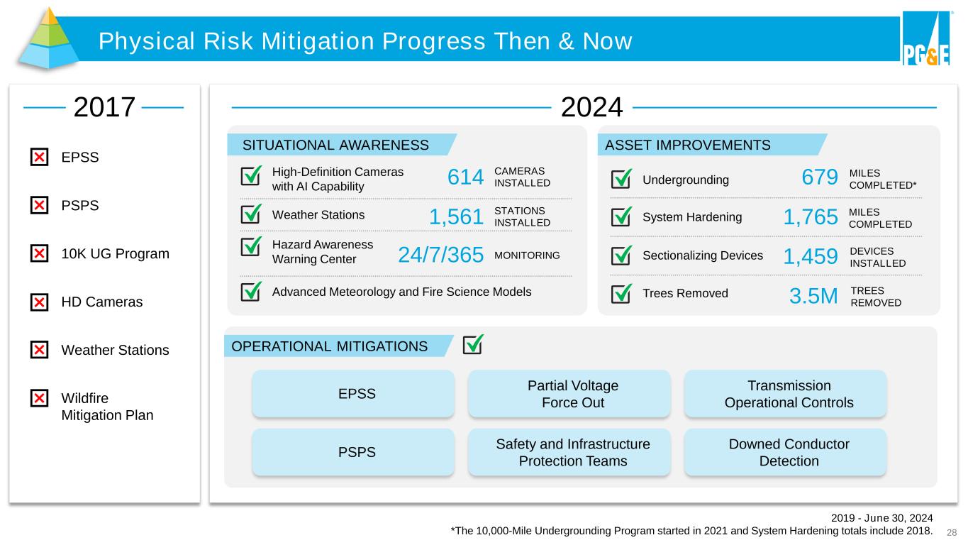 27 Wildfire Mitigation Plan Progress Exhibit E: PG&E Corporation's 2020 and 2021 Earnings Guidance Undergrounding Our Lines Undergrounding powerlines to reduce wildfires caused by equipment System Hardening Strengthening our grid by installing stronger poles, covered powerlines and undergrounding Sectionalizing Devices and Transmission Switches Separating the grid into smaller sections and narrowing the scope of Public Safety Power Shutoffs High-Definition Cameras Monitoring and responding to wildfires through increased visibility Weather Stations Better predicting and responding to severe weather threats 7 48 120 300 664 2019 2020 2021 2022 2023 2024 914 188 530 741 1,224 1,671 2019 2020 2021 2022 2023 2024 1,951 241 899 1,209 1,351 1,427 2019 2020 2021 2022 2023 133 349 502 602 602 2019 2020 2021 2022 2023 627 1,005 1,313 1,424 1,424 2019 2020 2021 2022 2023 2019-2023 ACTUALS STATIONS INSTALLED 1,424 CAMERAS INSTALLED 602 DEVICES INSTALLED 1,427 LINE MILES HARDENED 1,671 MILES COMPLETED 664 2024 TARGET MILES 250 LINE MILES 280 PROGRAM COMPLETED PROGRAM COMPLETED PROGRAM COMPLETED Completed Target