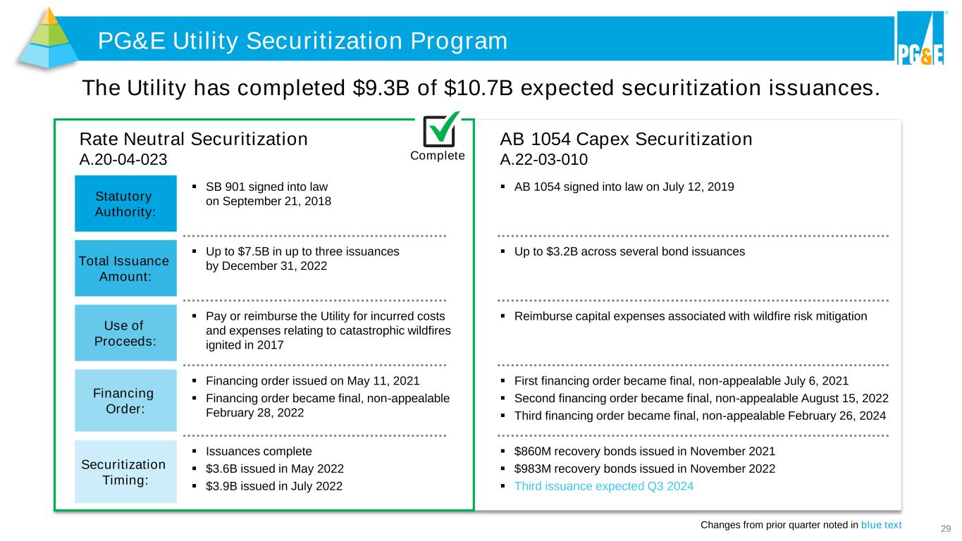 29 PG&E Utility Securitization Program Changes from prior quarter noted in blue text The Utility has completed $9.3B of $10.7B expected securitization issuances. Rate Neutral Securitization A.20-04-023 ▪ SB 901 signed into law on September 21, 2018Statutory Authority: ▪ AB 1054 signed into law on July 12, 2019 ▪ Up to $7.5B in up to three issuances by December 31, 2022Total Issuance Amount: ▪ Up to $3.2B across several bond issuances ▪ Pay or reimburse the Utility for incurred costs and expenses relating to catastrophic wildfires ignited in 2017 Use of Proceeds: ▪ Reimburse capital expenses associated with wildfire risk mitigation ▪ Financing order issued on May 11, 2021 ▪ Financing order became final, non-appealable February 28, 2022 Financing Order: ▪ First financing order became final, non-appealable July 6, 2021 ▪ Second financing order became final, non-appealable August 15, 2022 ▪ Third financing order became final, non-appealable February 26, 2024 ▪ Issuances complete ▪ $3.6B issued in May 2022 ▪ $3.9B issued in July 2022 Securitization Timing: ▪ $860M recovery bonds issued in November 2021 ▪ $983M recovery bonds issued in November 2022 ▪ Third issuance expected Q3 2024 AB 1054 Capex Securitization A.22-03-010Complete