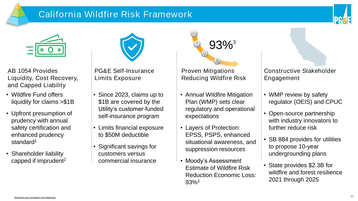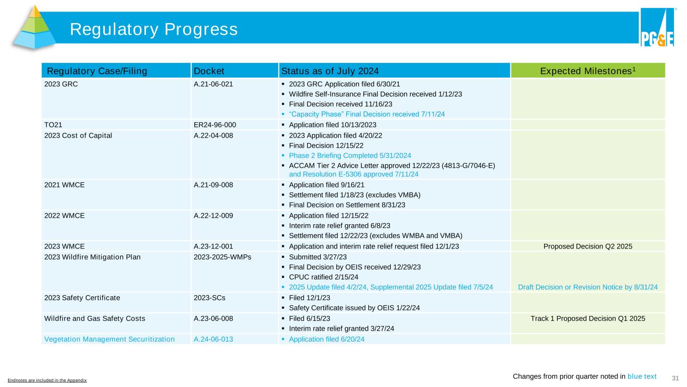 30 California Wildfire Risk Framework AB 1054 Provides Liquidity, Cost Recovery, and Capped Liability • Wildfire Fund offers liquidity for claims >$1B • Upfront presumption of prudency with annual safety certification and enhanced prudency standard1 • Shareholder liability capped if imprudent2 Constructive Stakeholder Engagement • WMP review by safety regulator (OEIS) and CPUC • Open-source partnership with industry innovators to further reduce risk • SB 884 provides for utilities to propose 10-year undergrounding plans • State provides $2.3B for wildfire and forest resilience 2021 through 2025 PG&E Self-Insurance Limits Exposure • Since 2023, claims up to $1B are covered by the Utility’s customer-funded self-insurance program • Limits financial exposure to $50M deductible • Significant savings for customers versus commercial insurance Proven Mitigations Reducing Wildfire Risk • Annual Wildfire Mitigation Plan (WMP) sets clear regulatory and operational expectations • Layers of Protection: EPSS, PSPS, enhanced situational awareness, and suppression resources • Moody’s Assessment Estimate of Wildfire Risk Reduction Economic Loss: 93%3 93%3 Endnotes are included in the Appendix