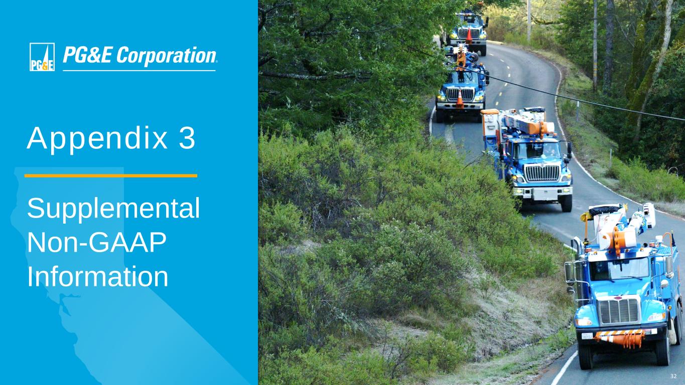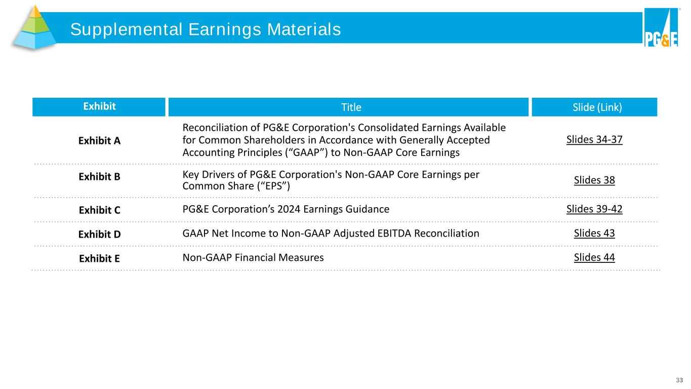 33 Supplemental Earnings Materials Exhibit E: PG&E Corporation's 2020 and 2021 Earnings Guidance Exhibit Title Slide (Link) Exhibit A Reconciliation of PG&E Corporation's Consolidated Earnings Available for Common Shareholders in Accordance with Generally Accepted Accounting Principles (“GAAP”) to Non-GAAP Core Earnings Slides 34-37 Exhibit B Key Drivers of PG&E Corporation's Non-GAAP Core Earnings per Common Share (“EPS”) Slides 38 Exhibit C PG&E Corporation’s 2024 Earnings Guidance Slides 39-42 Exhibit D GAAP Net Income to Non-GAAP Adjusted EBITDA Reconciliation Slides 43 Exhibit E Non-GAAP Financial Measures Slides 44