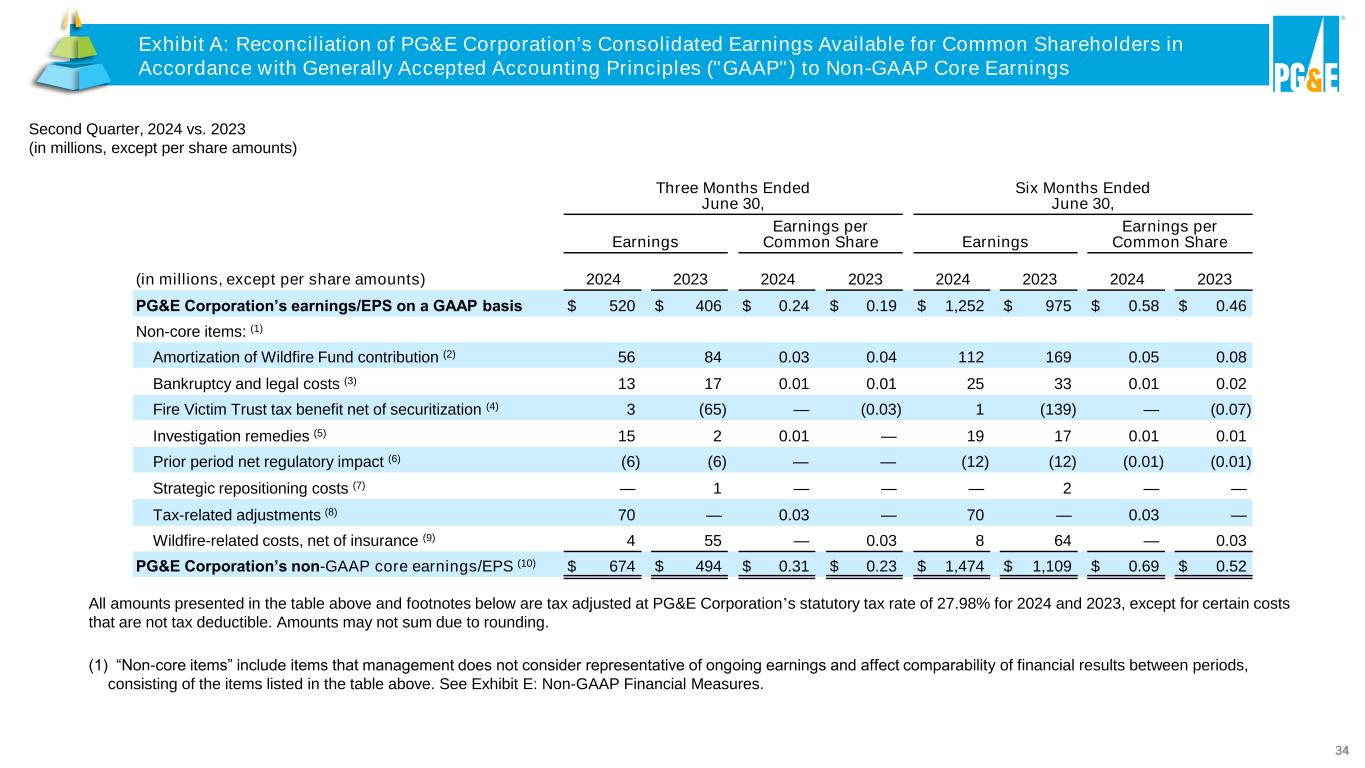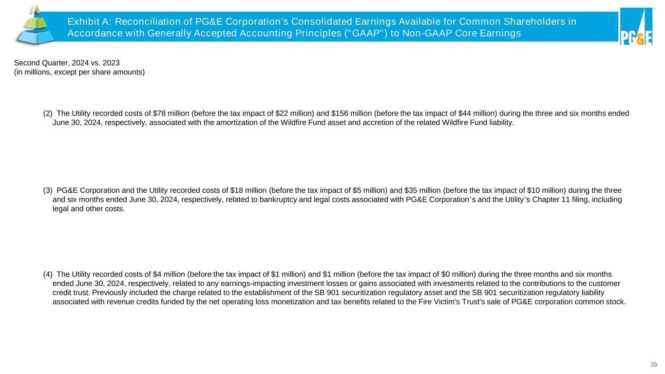 34 Exhibit A: Reconciliation of PG&E Corporation's Consolidated Earnings Available for Common Shareholders in Accordance with Generally Accepted Accounting Principles ("GAAP") to Non-GAAP Core Earnings Three Months Ended June 30, Six Months Ended June 30, Earnings Earnings per Common Share Earnings Earnings per Common Share (in millions, except per share amounts) 2024 2023 2024 2023 2024 2023 2024 2023 PG&E Corporation’s earnings/EPS on a GAAP basis $ 520 $ 406 $ 0.24 $ 0.19 $ 1,252 $ 975 $ 0.58 $ 0.46 Non-core items: (1) Amortization of Wildfire Fund contribution (2) 56 84 0.03 0.04 112 169 0.05 0.08 Bankruptcy and legal costs (3) 13 17 0.01 0.01 25 33 0.01 0.02 Fire Victim Trust tax benefit net of securitization (4) 3 (65) — (0.03) 1 (139) — (0.07) Investigation remedies (5) 15 2 0.01 — 19 17 0.01 0.01 Prior period net regulatory impact (6) (6) (6) — — (12) (12) (0.01) (0.01) Strategic repositioning costs (7) — 1 — — — 2 — — Tax-related adjustments (8) 70 — 0.03 — 70 — 0.03 — Wildfire-related costs, net of insurance (9) 4 55 — 0.03 8 64 — 0.03 PG&E Corporation’s non-GAAP core earnings/EPS (10) $ 674 $ 494 $ 0.31 $ 0.23 $ 1,474 $ 1,109 $ 0.69 $ 0.52 All amounts presented in the table above and footnotes below are tax adjusted at PG&E Corporation’s statutory tax rate of 27.98% for 2024 and 2023, except for certain costs that are not tax deductible. Amounts may not sum due to rounding. Second Quarter, 2024 vs. 2023 (in millions, except per share amounts) (1) “Non-core items” include items that management does not consider representative of ongoing earnings and affect comparability of financial results between periods, consisting of the items listed in the table above. See Exhibit E: Non-GAAP Financial Measures. Exhibit A: Reconciliation of PG&E Corporation's Consolidated Earnings Available for Common Shareholders in Accordance with Generally Accepted Accounting Principles ("GAAP") to Non-GAAP Core Earnings