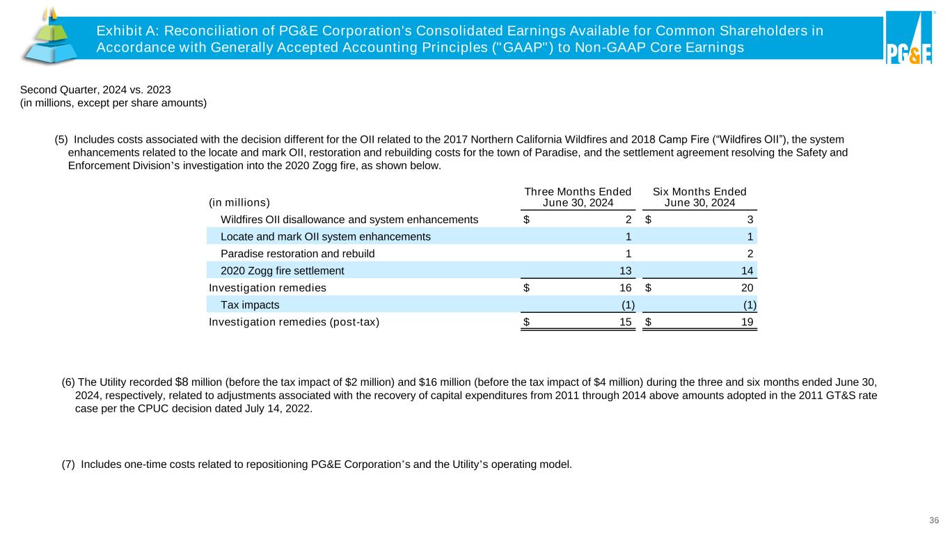 35 Second Quarter, 2024 vs. 2023 (in millions, except per share amounts) (3) PG&E Corporation and the Utility recorded costs of $18 million (before the tax impact of $5 million) and $35 million (before the tax impact of $10 million) during the three and six months ended June 30, 2024, respectively, related to bankruptcy and legal costs associated with PG&E Corporation’s and the Utility’s Chapter 11 filing, including legal and other costs. (2) The Utility recorded costs of $78 million (before the tax impact of $22 million) and $156 million (before the tax impact of $44 million) during the three and six months ended June 30, 2024, respectively, associated with the amortization of the Wildfire Fund asset and accretion of the related Wildfire Fund liability. Exhibit A: Reconciliation of PG&E Corporation's Consolidated Earnings Available for Common Shareholders in Accordance with Generally Accepted Accounting Principles ("GAAP") to Non-GAAP Core Earnings (4) The Utility recorded costs of $4 million (before the tax impact of $1 million) and $1 million (before the tax impact of $0 million) during the three months and six months ended June 30, 2024, respectively, related to any earnings-impacting investment losses or gains associated with investments related to the contributions to the customer credit trust. Previously included the charge related to the establishment of the SB 901 securitization regulatory asset and the SB 901 securitization regulatory liability associated with revenue credits funded by the net operating loss monetization and tax benefits related to the Fire Victim's Trust's sale of PG&E corporation common stock. Exhibit A: Reconciliation of PG&E Corporation's Consolidated Earnings Available for Common Shareholders in Accordance with Generally Accepted Accounting Principles ("GAAP") to Non-GAAP Core Earnings