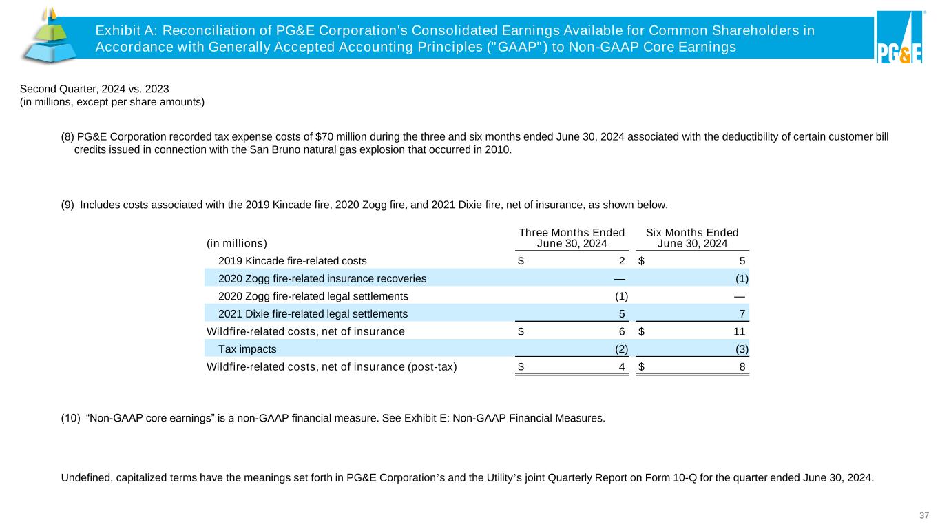 36 Second Quarter, 2024 vs. 2023 (in millions, except per share amounts) (in millions) Three Months Ended June 30, 2024 Six Months Ended June 30, 2024 Wildfires OII disallowance and system enhancements $ 2 $ 3 Locate and mark OII system enhancements 1 1 Paradise restoration and rebuild 1 2 2020 Zogg fire settlement 13 14 Investigation remedies $ 16 $ 20 Tax impacts (1) (1) Investigation remedies (post-tax) $ 15 $ 19 (5) Includes costs associated with the decision different for the OII related to the 2017 Northern California Wildfires and 2018 Camp Fire (“Wildfires OII”), the system enhancements related to the locate and mark OII, restoration and rebuilding costs for the town of Paradise, and the settlement agreement resolving the Safety and Enforcement Division’s investigation into the 2020 Zogg fire, as shown below. Exhibit A: Reconciliation of PG&E Corporation's Consolidated Earnings Available for Common Shareholders in Accordance with Generally Accepted Accounting Principles ("GAAP") to Non-GAAP Core Earnings (6) The Utility recorded $8 million (before the tax impact of $2 million) and $16 million (before the tax impact of $4 million) during the three and six months ended June 30, 2024, respectively, related to adjustments associated with the recovery of capital expenditures from 2011 through 2014 above amounts adopted in the 2011 GT&S rate case per the CPUC decision dated July 14, 2022. Exhibit A: Reconciliation of PG&E Corporation's Consolidated Earnings Available for Common Shareholders in Accordance with Generally Accepted Accounting Principles ("GAAP") to Non-GAAP Core Earnings (7) Includes one-time costs related to repositioning PG&E Corporation’s and the Utility’s operating model.