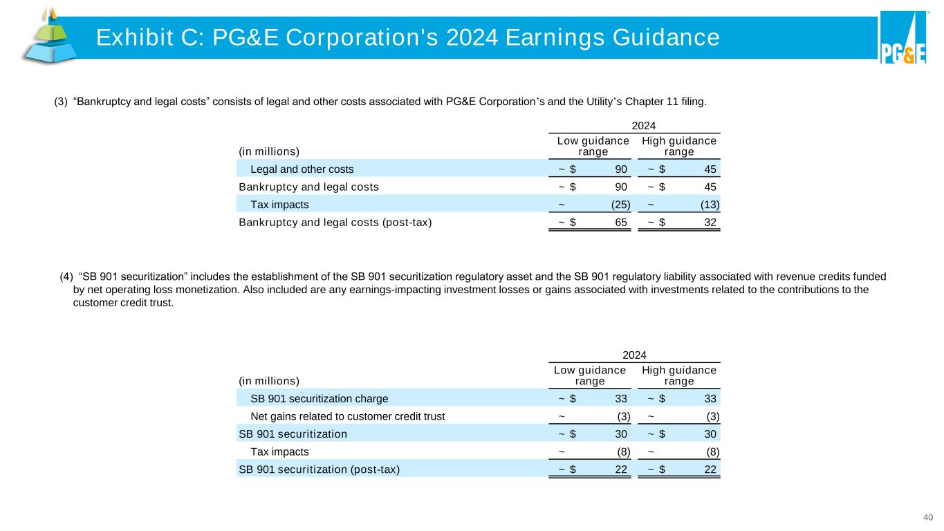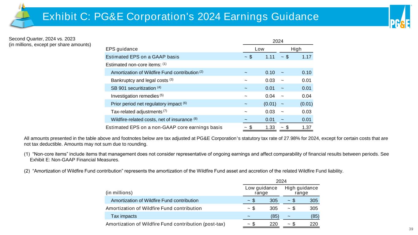 39 2024 EPS guidance Low High Estimated EPS on a GAAP basis ~ $ 1.11 ~ $ 1.17 Estimated non-core items: (1) Amortization of Wildfire Fund contribution (2) ~ 0.10 ~ 0.10 Bankruptcy and legal costs (3) ~ 0.03 ~ 0.01 SB 901 securitization (4) ~ 0.01 ~ 0.01 Investigation remedies (5) ~ 0.04 ~ 0.04 Prior period net regulatory impact (6) ~ (0.01) ~ (0.01) Tax-related adjustments (7) ~ 0.03 ~ 0.03 Wildfire-related costs, net of insurance (8) ~ 0.01 ~ 0.01 Estimated EPS on a non-GAAP core earnings basis ~ $ 1.33 ~ $ 1.37 All amounts presented in the table above and footnotes below are tax adjusted at PG&E Corporation’s statutory tax rate of 27.98% for 2024, except for certain costs that are not tax deductible. Amounts may not sum due to rounding. (1) “Non-core items” include items that management does not consider representative of ongoing earnings and affect comparability of financial results between periods. See Exhibit E: Non-GAAP Financial Measures. 2024 (in millions) Low guidance range High guidance range Amortization of Wildfire Fund contribution ~ $ 305 ~ $ 305 Amortization of Wildfire Fund contribution ~ $ 305 ~ $ 305 Tax impacts ~ (85) ~ (85) Amortization of Wildfire Fund contribution (post-tax) ~ $ 220 ~ $ 220 (2) “Amortization of Wildfire Fund contribution” represents the amortization of the Wildfire Fund asset and accretion of the related Wildfire Fund liability. Exhibit C: PG&E Corporation's 2024 Earnings GuidanceExhibit C: PG&E Corpor tion's 20 4 Earnings Guidance Second Quarter, 2024 vs. 2023 (in millions, except per share amounts)